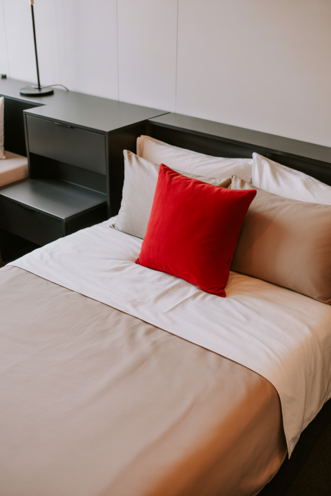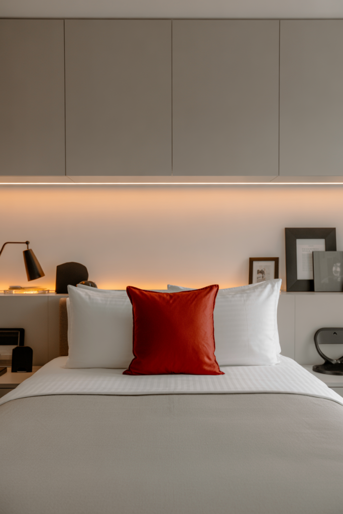 A single burst of red adds energy and personality to a minimal dorm layout. Keep the palette mostly neutral and let the red detail — a pillow, art print, or lamp — become the focal point. Pair with soft black accents and a lightly layered aesthetic foundation to avoid visual chaos.
