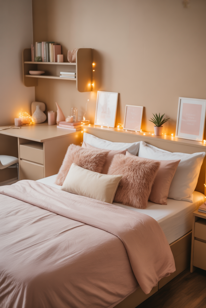 Soft cozy pink can transform a dorm from plain to welcoming with almost no effort. Combine pink textiles with gentle neutrals and one grounding shade like earthy tan. Add a small pink storage basket or wall print to tie the room together while preserving a clean aesthetic.