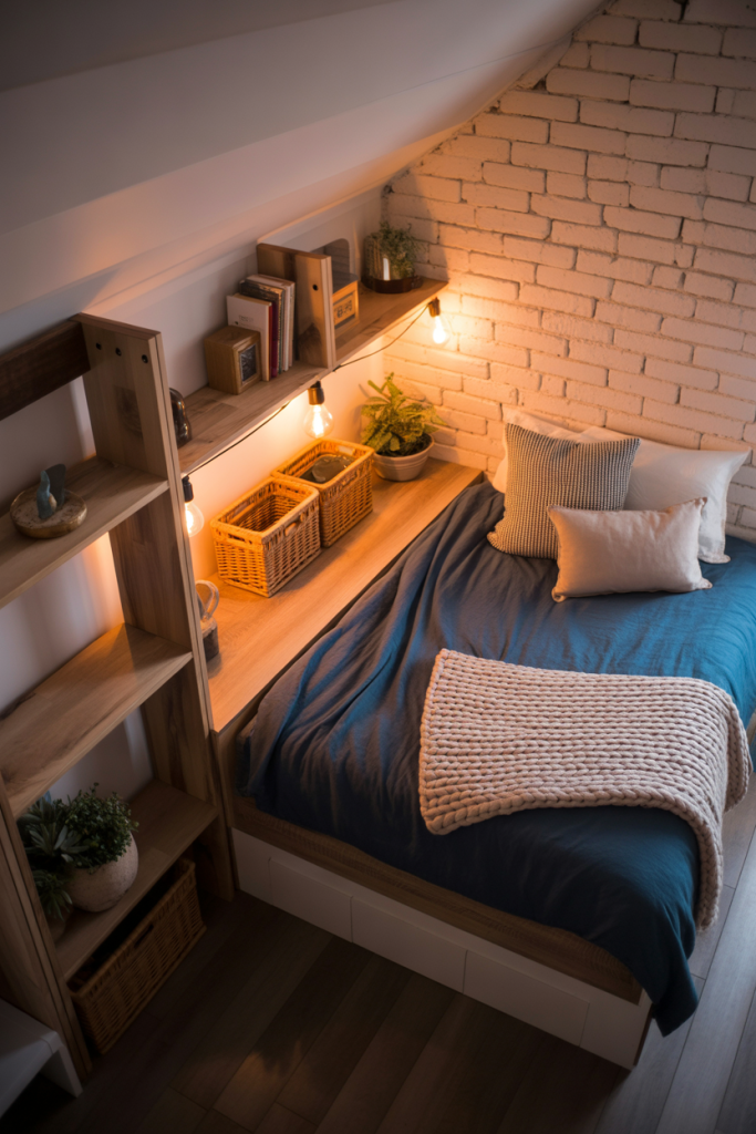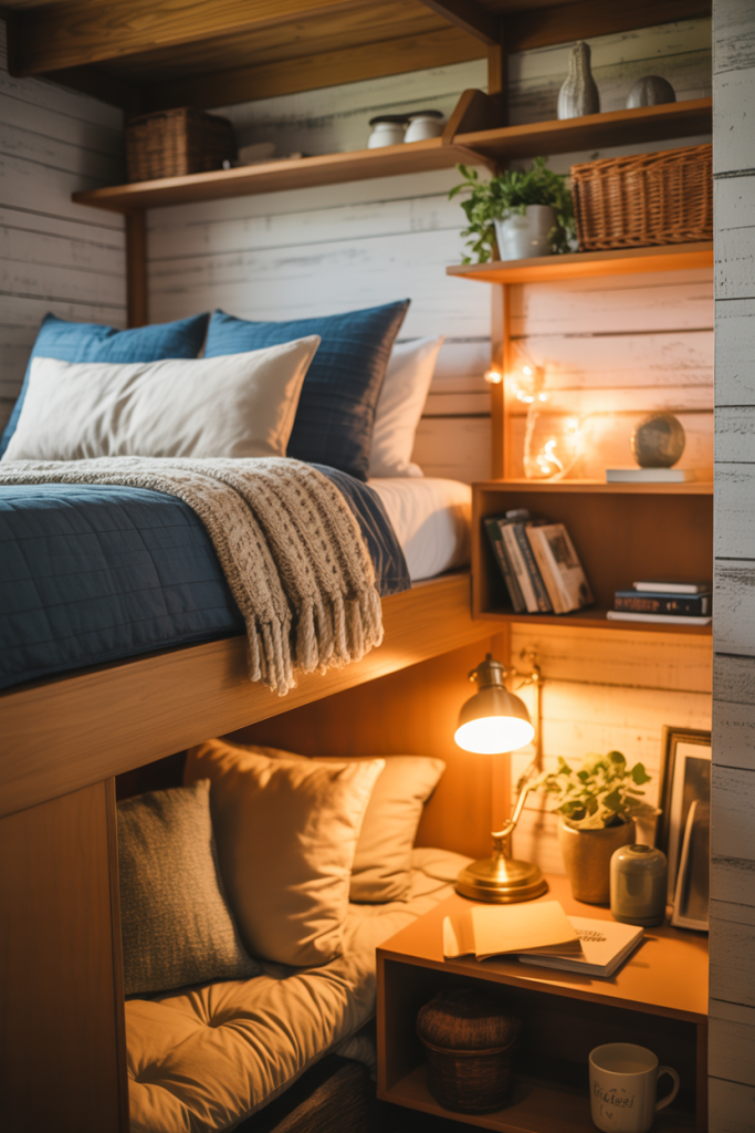 A small loft corner with touches of blue and soft rustic accents brings a warm-meets-modern feel. Choose a simple wood-toned stool and one cozy blanket to complete the look. If your dorm allows loft adjustments, raising the bed opens enough room for a tiny study nook or reading space.