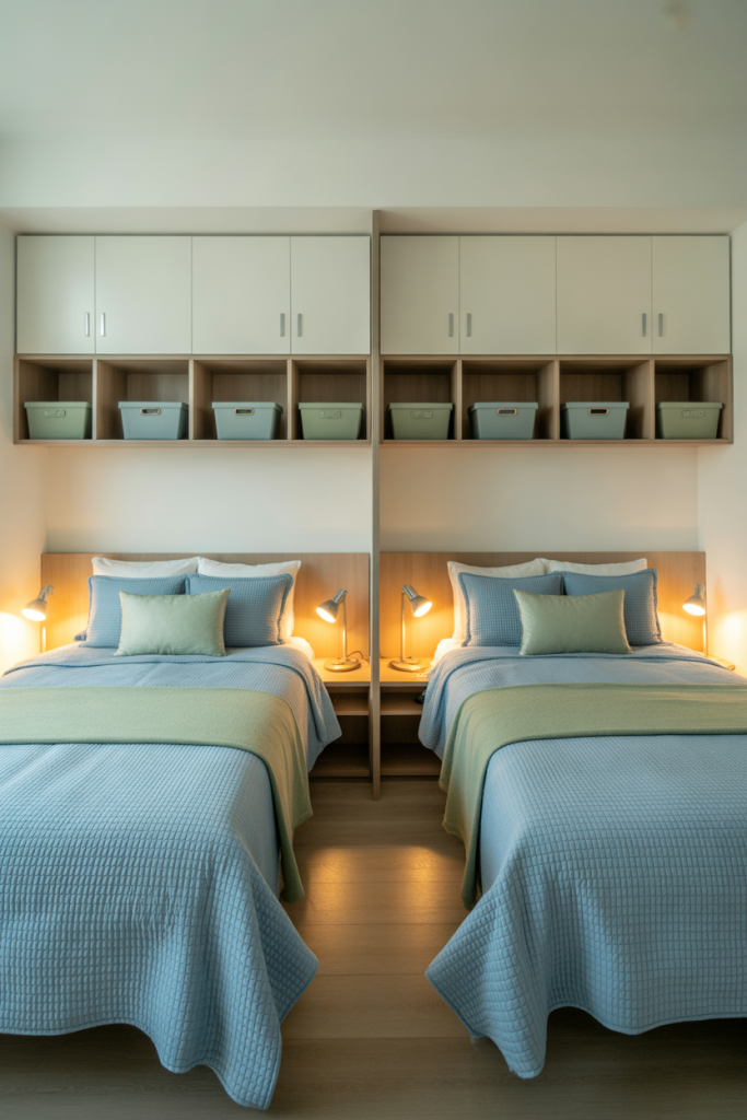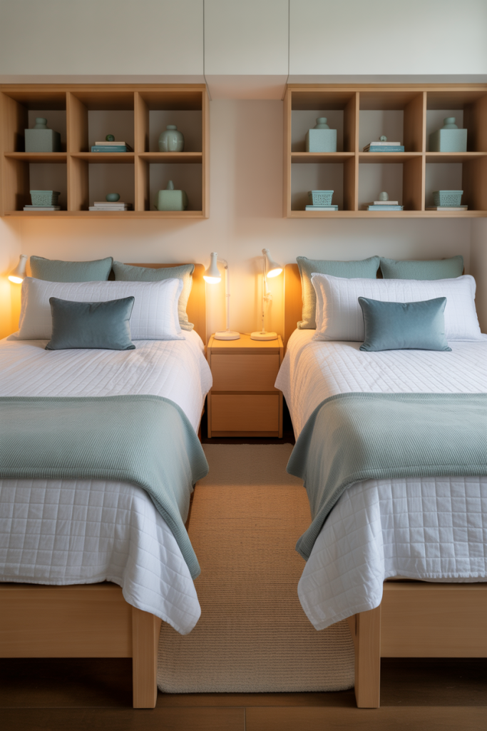 Rooms for two people benefit from balanced color choices and mirrored layouts. Pick a palette with green or light blue accents on both sides to keep the room cohesive. Add one aesthetic statement piece — like matching shelves — to visually connect the space without forcing identical décor.