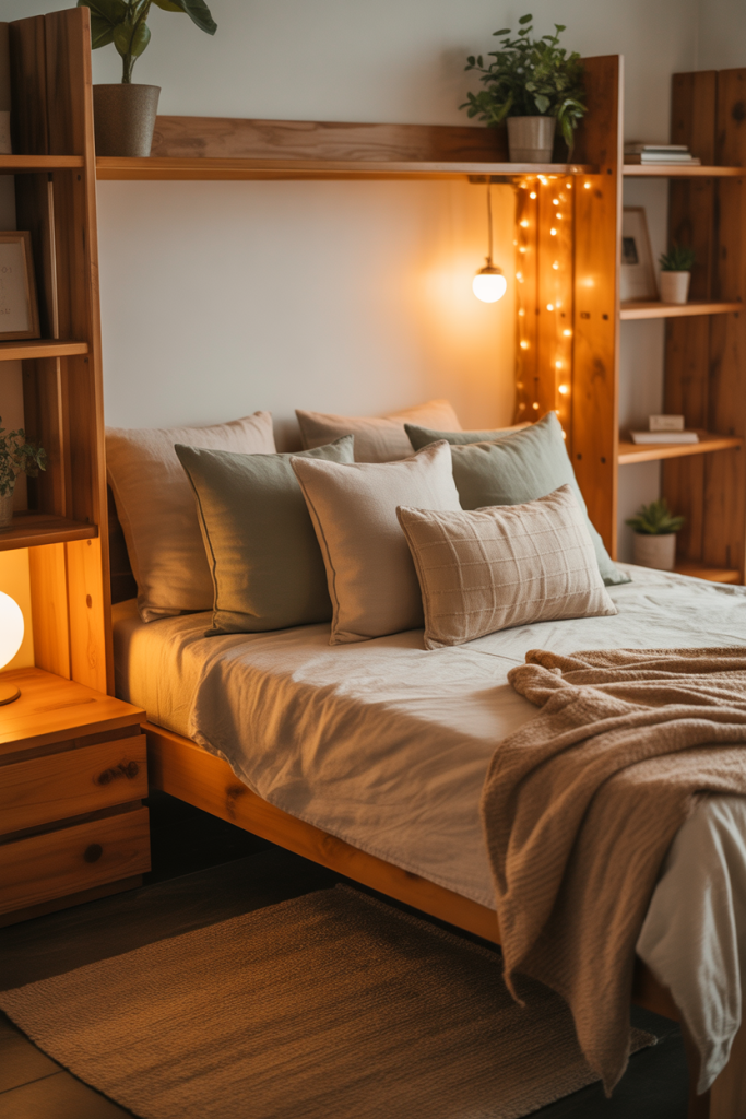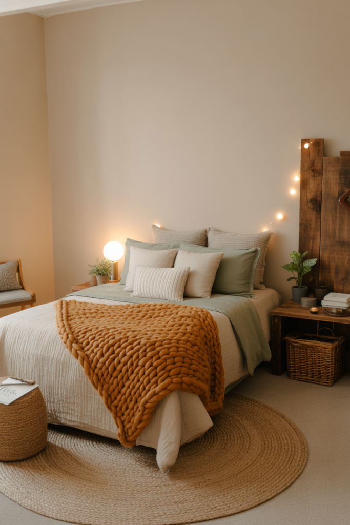 Rustic doesn’t have to mean heavy wood furniture — in fact, in dorm rooms it’s better expressed through soft rustic textures, warm neutrals, and small loft-compatible accents. Add a subtle wood-toned detail and balance it with gentle lighting to maintain a clean, aesthetic presence.