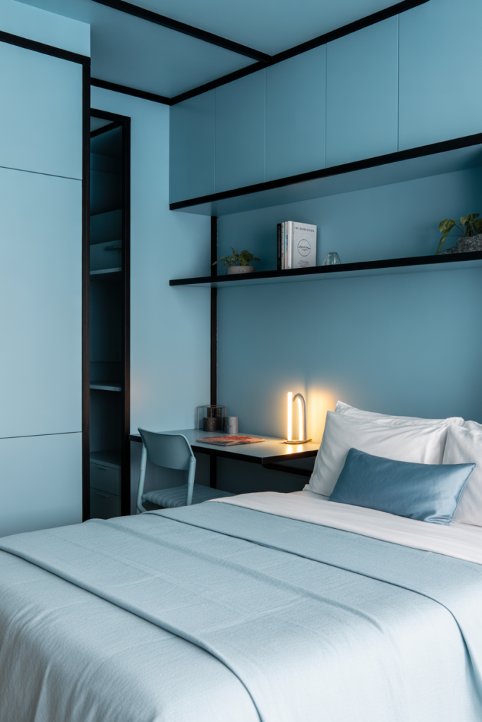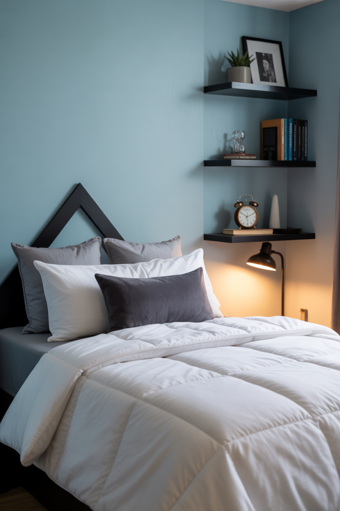 Pairing gentle blue tones with grounding black accents creates a modern dorm look that still feels approachable. Add a single light blue throw or pillow to brighten the palette, and layer simple aesthetic textures to maintain a clean, inviting atmosphere in tight spaces.