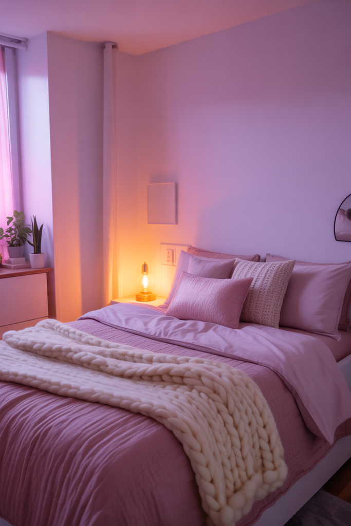 Combining soft pink and muted purple accents creates a dreamy evening mood without overpowering small spaces. Add a cozy pink blanket and one smooth aesthetic lamp for a gentle glow. This palette feels fresh, calm, and expressive — perfect for students who love warm nighttime ambiance.