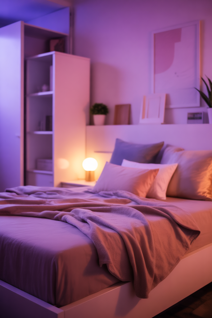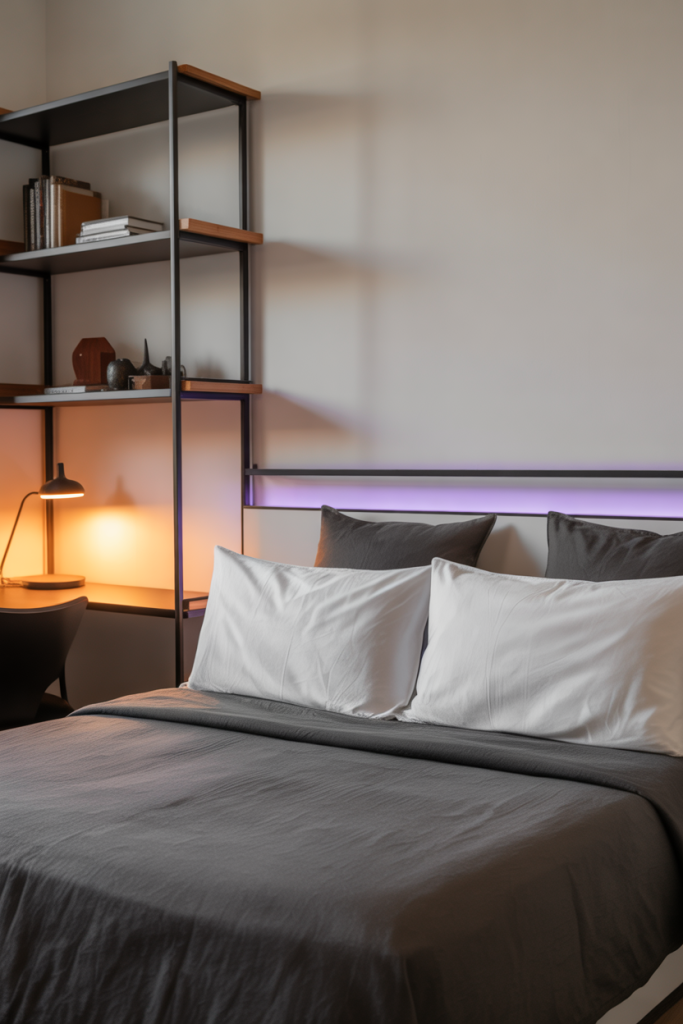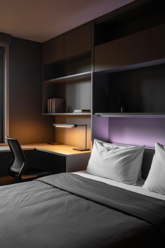 A subtle glow in soft purple tones can turn a simple dorm into a calming retreat after long days. Pair minimal LED accents with smooth textures and one grounding shade like black. A gentle aesthetic touch keeps the scene cohesive while leaving room for personality without overwhelming the small layout.