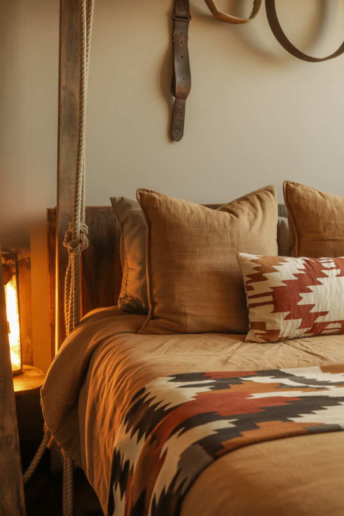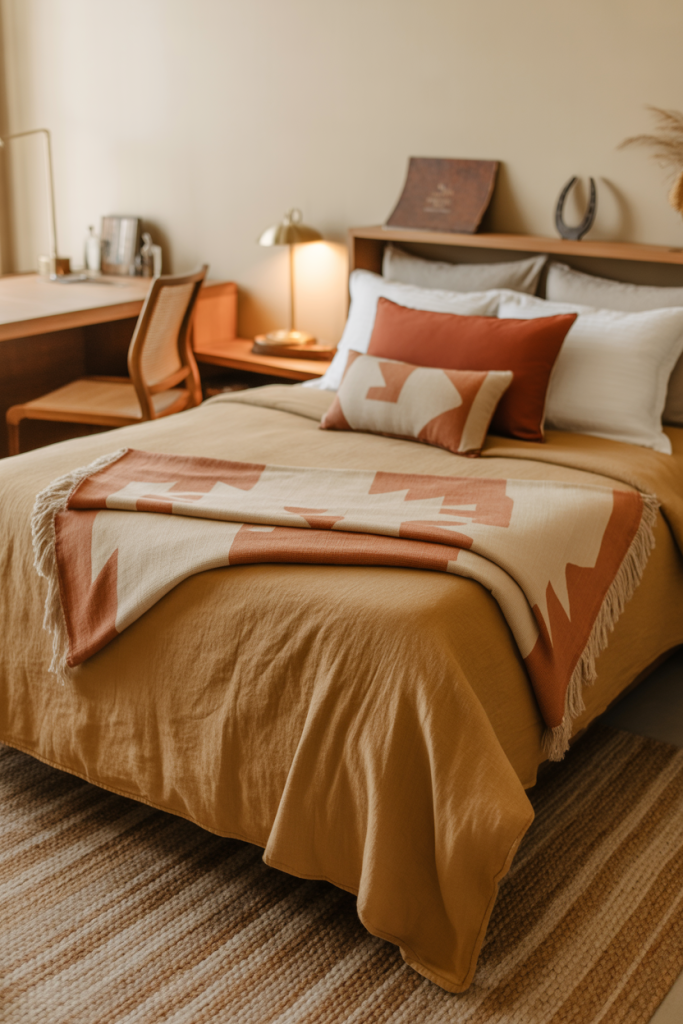Western-inspired dorm rooms balance texture and warmth through subtle nods to the style — a patterned throw, a western pillow, or a muted red accent. Layering these details with simple, cozy bedding prevents the room from feeling theme-heavy. Using soft tan fabrics keeps everything approachable and college-friendly.