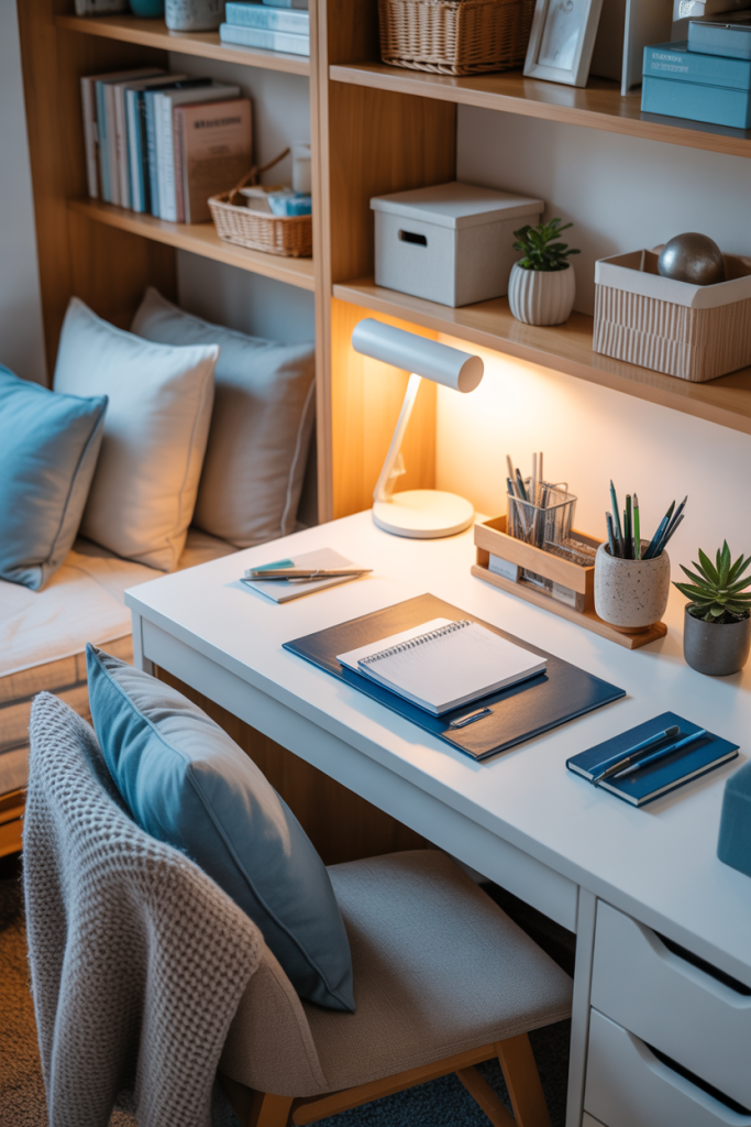 Creating a calm loft nook can instantly make a small dorm feel larger. Pairing gentle neutrals with a pop of light blue or a soft aesthetic accent keeps the space fresh without overwhelm. This setup works especially well with lofted beds, opening up precious floor space while still feeling inviting and cozy.