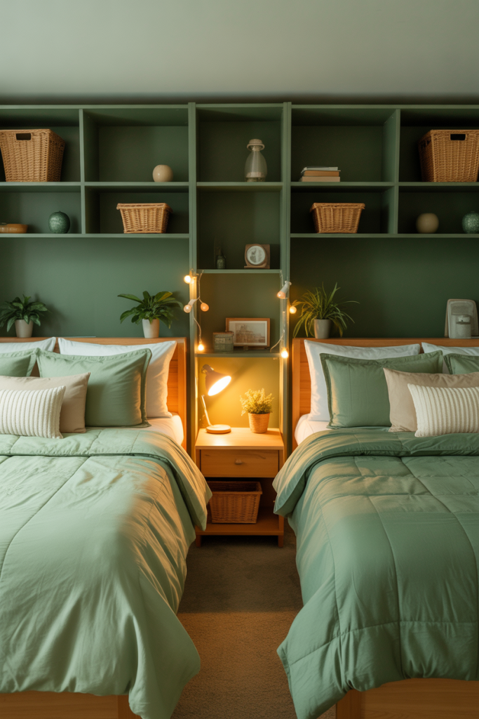 Shared rooms for two people feel more harmonious when color choices overlap. A light green theme, paired with one freshman-friendly detail like matching organizers, keeps both sides coordinated. Adding a touch of earthy texture helps ground the palette and avoids the overly bright dorm look.