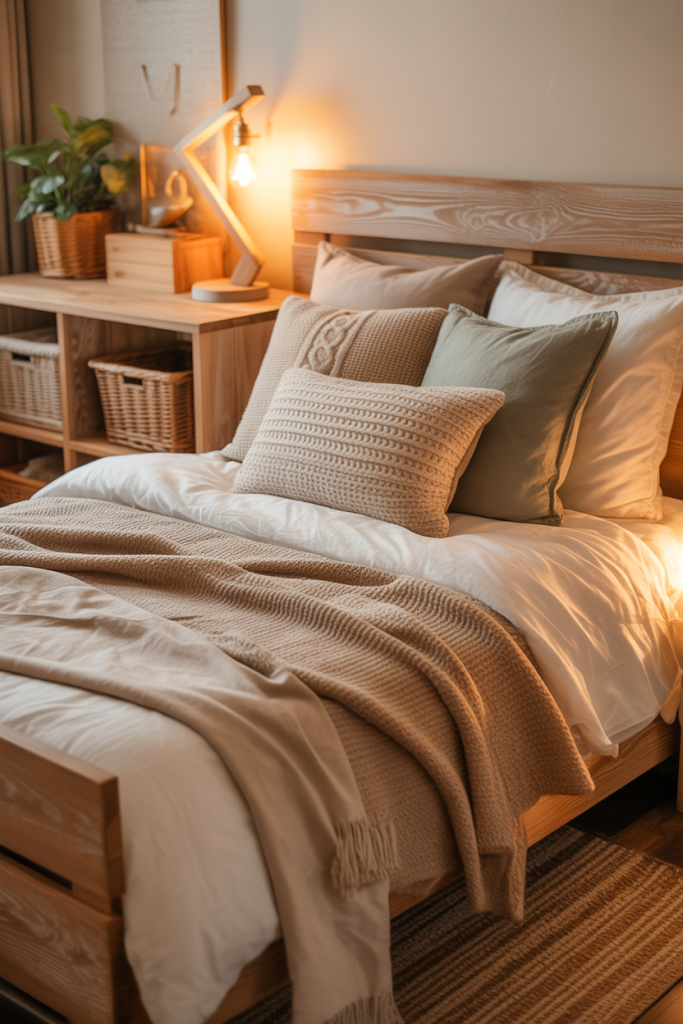 If you’re dreaming of something grounded and serene, earthy layering brings a natural softness to tight spaces. Think textured throws, warm neutrals, and hints of green for balance. Adding subtle earthy tones or a muted rustic detail keeps the room feeling curated without clutter. A whisper of purple works surprisingly well in this palette.