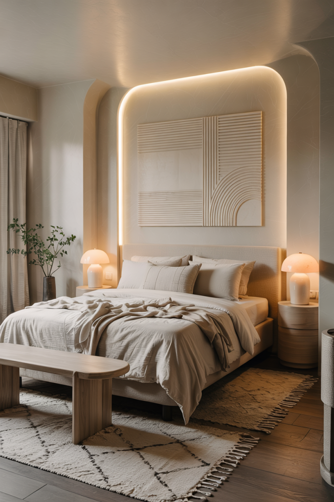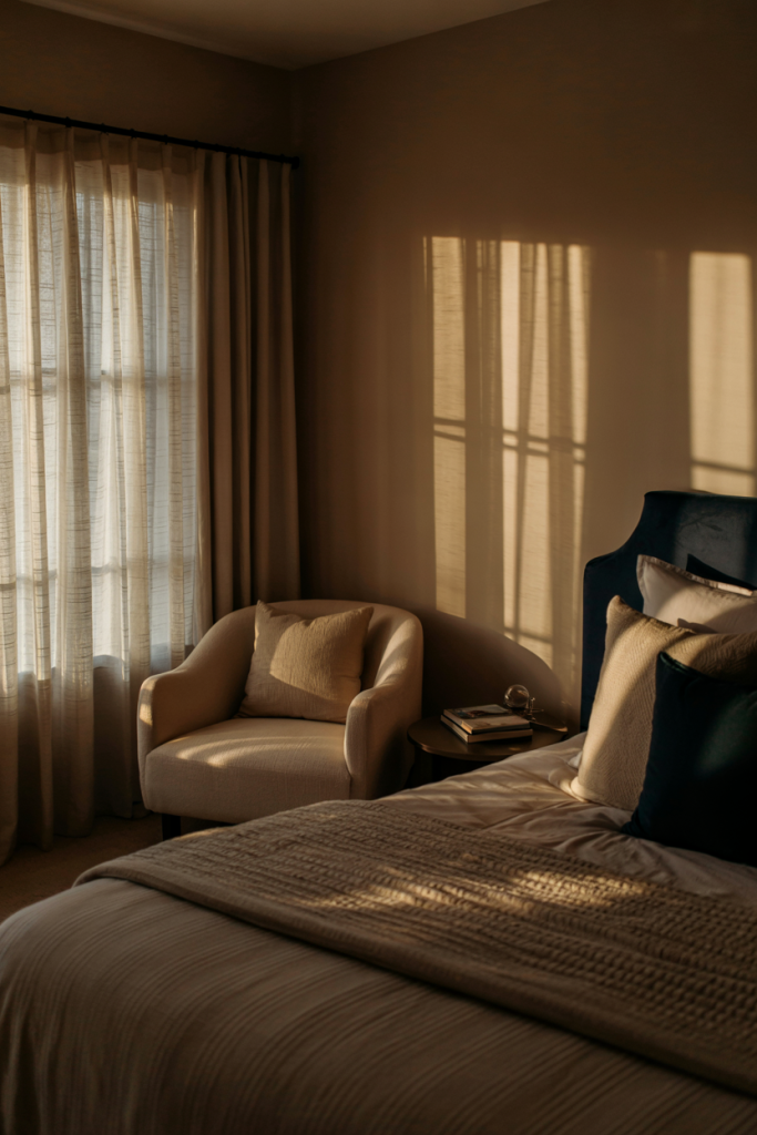 A romantic bedroom doesn’t require ornate details; instead, it thrives on touchable fabrics and low, layered light. Pairing blush undertones with warm neutrals creates a cocooning mood, especially when you introduce gentle romantic elements and hints of moody ambiance.
