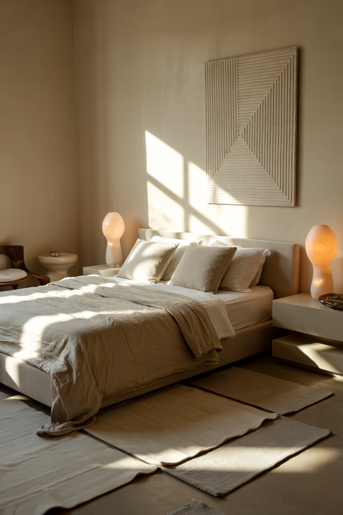 A gentle neutral scheme immediately creates a sense of calm in the primary bedroom. Adding sculptural lights, layered textures, and relaxing warm elements completes the approach. Modern luxury and quiet design sensibilities converge, making for an easy entry for anyone looking to elevate their space without making a dramatic change to the colors.