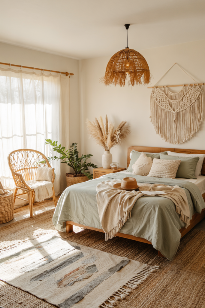 From a practical standpoint, boho styling thrives when you limit your palette. Choosing one dominant color and supporting it with natural textures keeps the room cohesive and cozy—a detail many people overlook when layering décor.