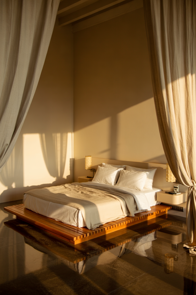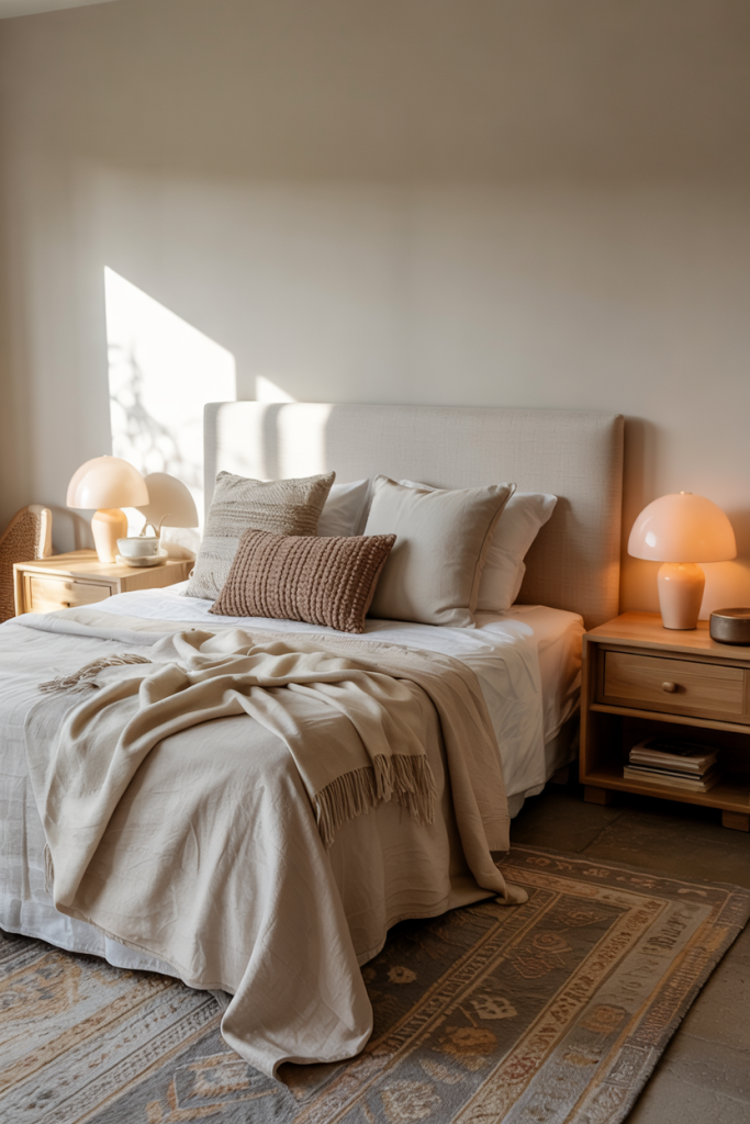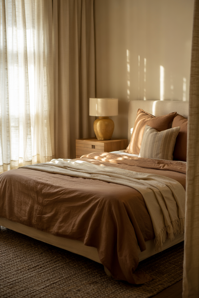 A combination of earthy fabrics and natural layers with grounded colors works wonders on the aesthetics of this warm bedroom. The mixing of soft blankets and wooden pieces enhances the depth of the room but isn’t visually overwhelming. With gentle touches of brown and a soft neutral palette along with the cozy theme, the room feels ideal for a calm retreat, and anyone looking for a cozy space with understated design would love to spend time in here.
