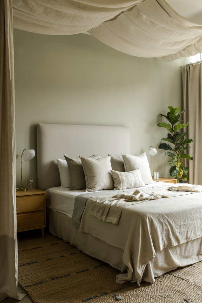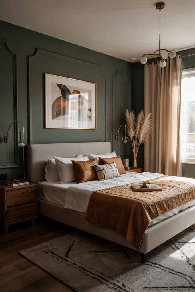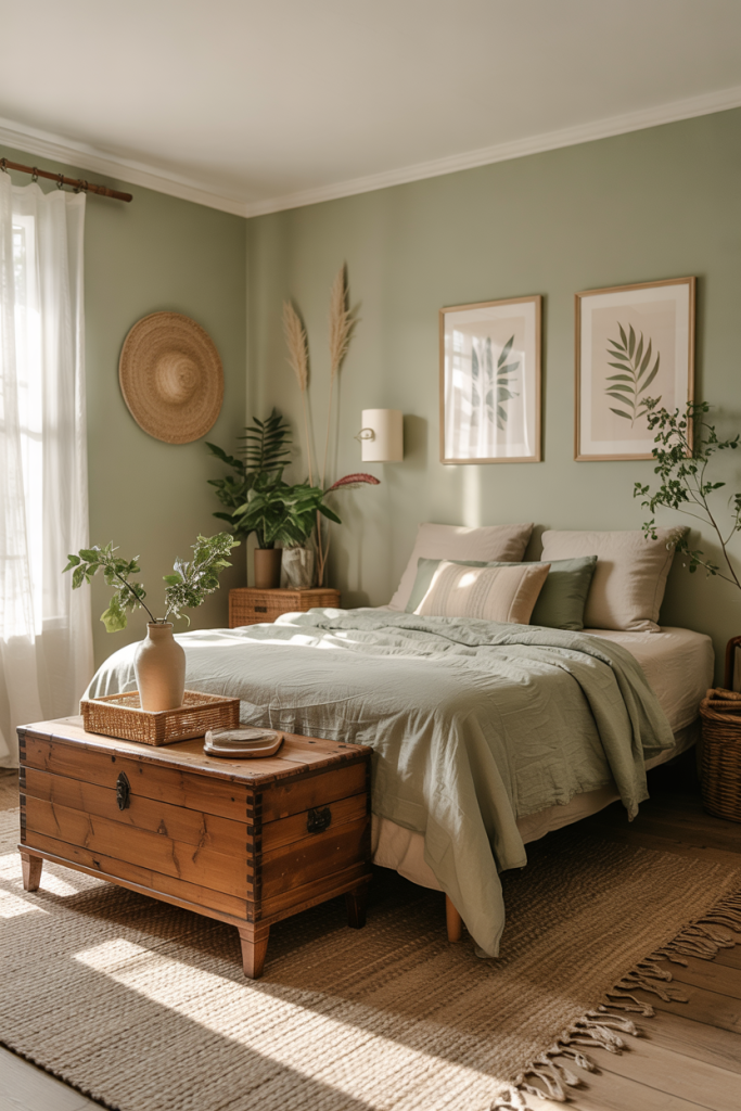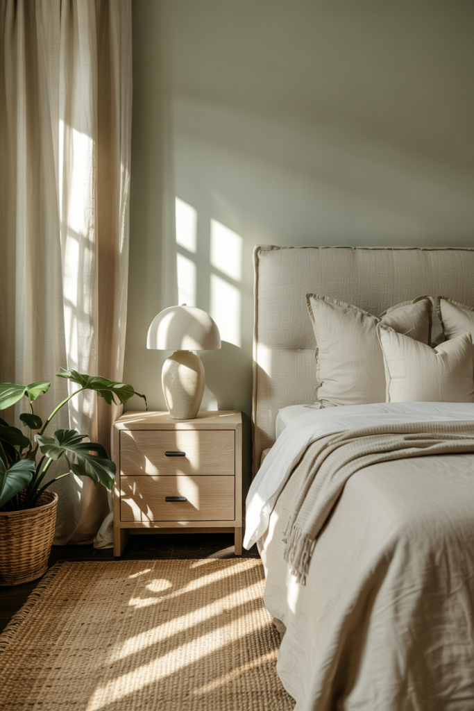 Sage has become a runaway favorite for homeowners looking for light color without losing serenity. Paired with upholstered headboards, rounded silhouettes, and airy fabrics, it creates a bedroom that feels both grounded and rejuvenating. This look sits comfortably between neutral softness and organic charm.