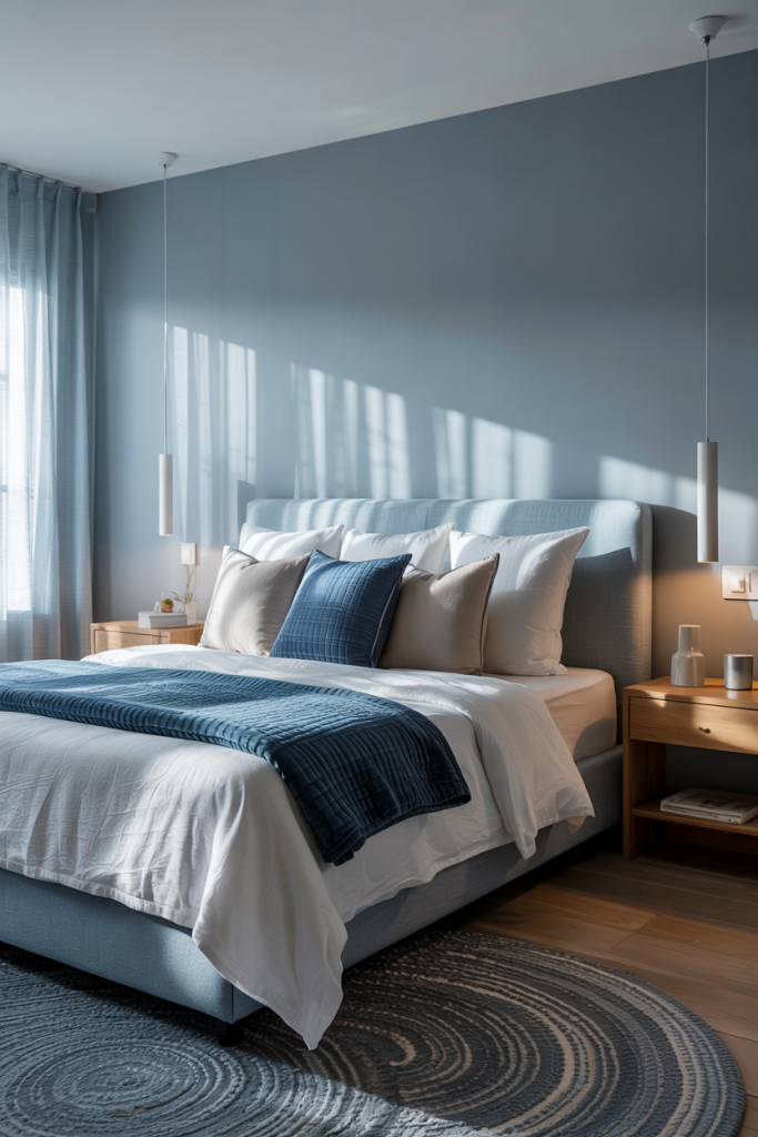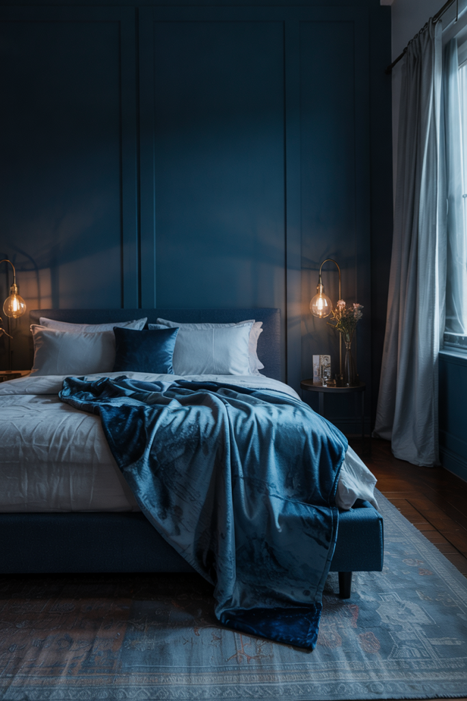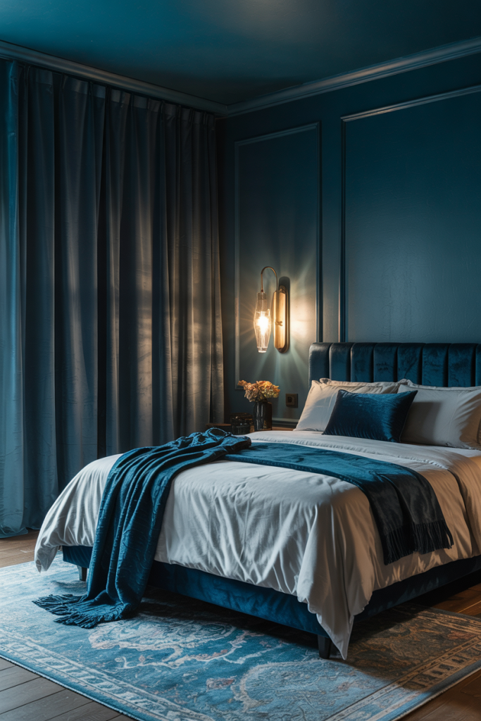 Deep blues paired with elegant textiles create a bedroom that feels dramatic yet refined. Adding layered fabrics, velvet details, or metallic accents enhances the richness. Touches of blue with subtle modern luxury cues keep the palette cozy rather than cold.