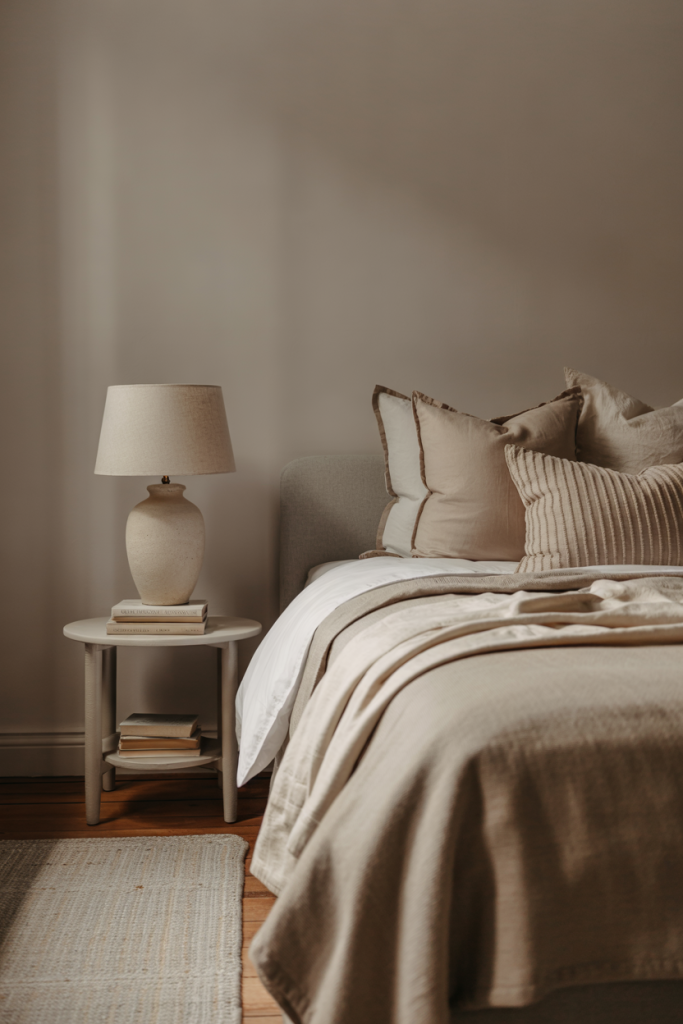 This idea centers around gentle neutrals layered over gray foundations. The effect is soft, flexible, and perfect for those who change decor seasonally. When paired with textured bedding or warm lighting, this palette stays relaxing and inviting without leaning too cool.