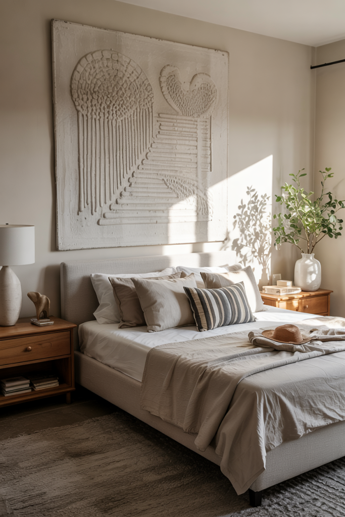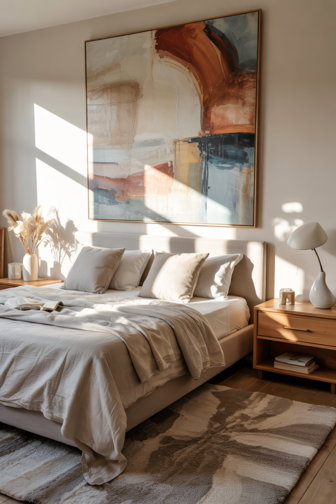 Bringing one oversized artwork into a master bedroom adds personality without clutter. This approach keeps the focus simple yet expressive. Paired with large visual elements and a neutral palette, the room feels curated but still easy to live in every day.