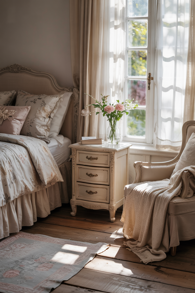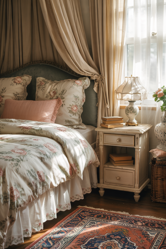 A romantic cottage-inspired bedroom uses soft florals, delicate fabrics, and warm lighting. Layering washed woods with gentle colors keeps the style sweet but not overly vintage. Notes of romantic charm combined with cozy cottage textures make it warmly personal.