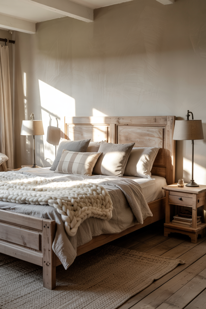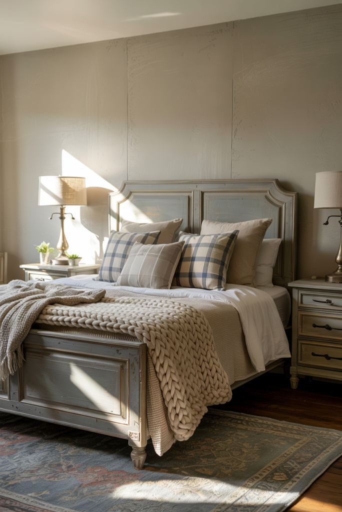Real homeowner behavior shows farmhouse bedrooms often become “drop zones.” Limit small decorative pieces and rely on bigger textures—knit throws, heavy quilts—to keep the space tidy and cohesive.