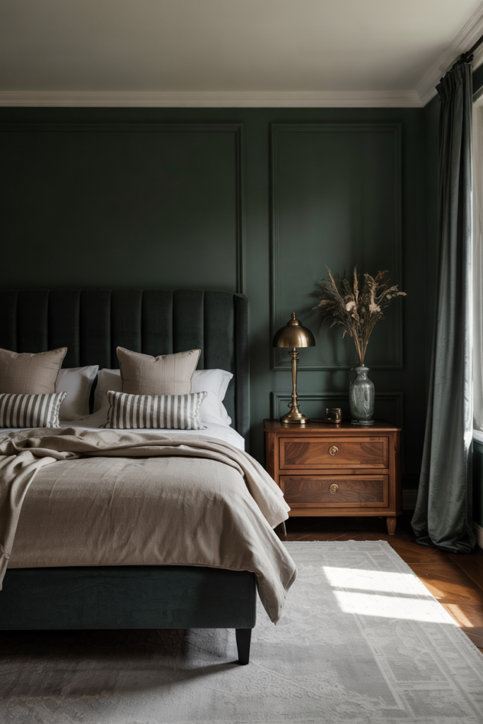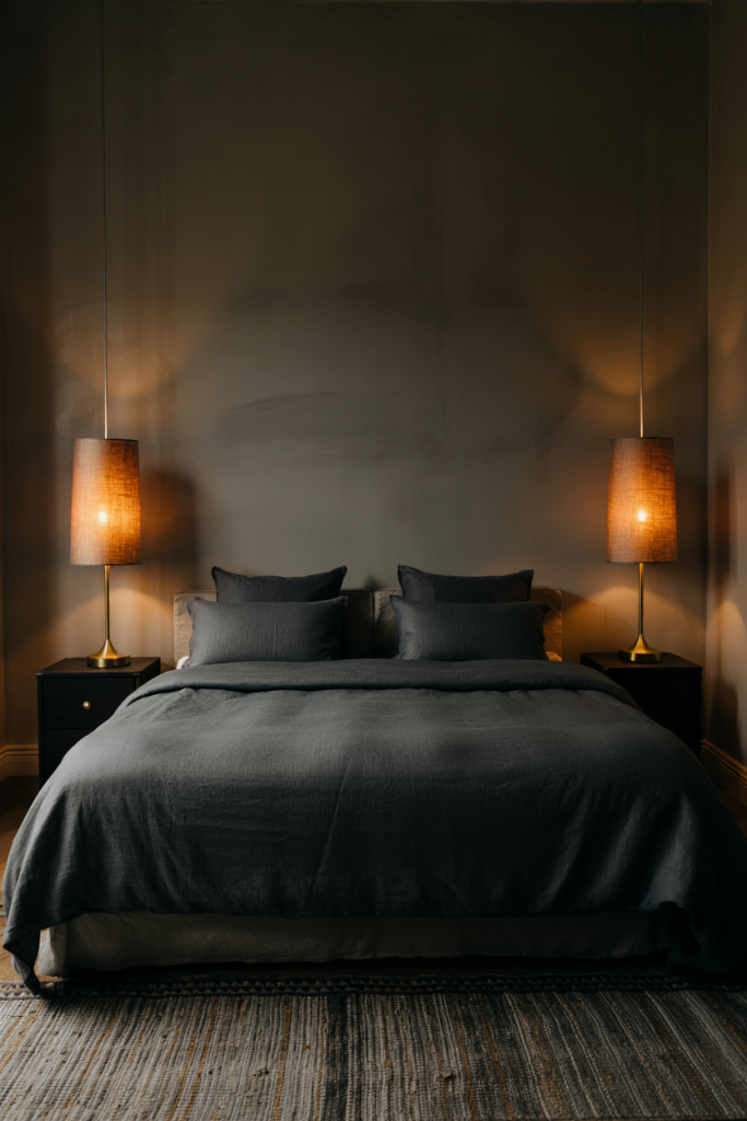 A deeper bedroom palette feels immediately intimate, especially with matte surfaces and layered lighting. Blending soft fabrics with dark color tones creates a warm refuge that doesn’t feel overwhelming. Add metallic details to keep the mood elevated and subtly luxurious.