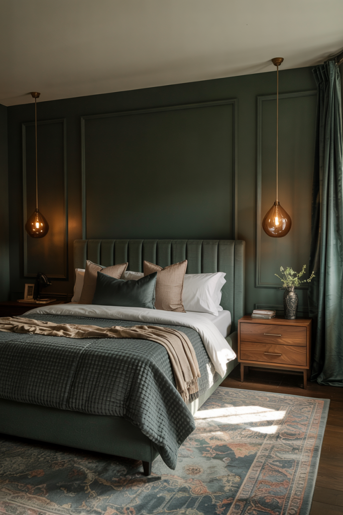 A rich green backdrop paired with smooth furniture lines creates a sophisticated, modern-feeling master suite. With hints of dark green balanced by soft fabrics and gentle contrast, the room feels dramatic without sacrificing comfort. Touches of modern detail help tie everything together elegantly.