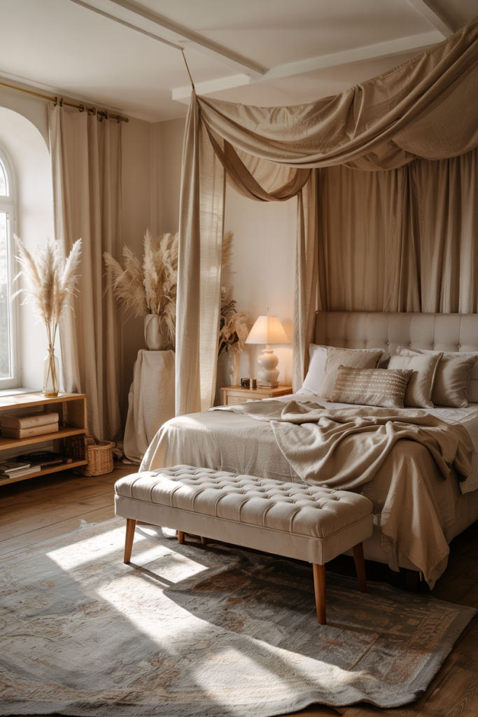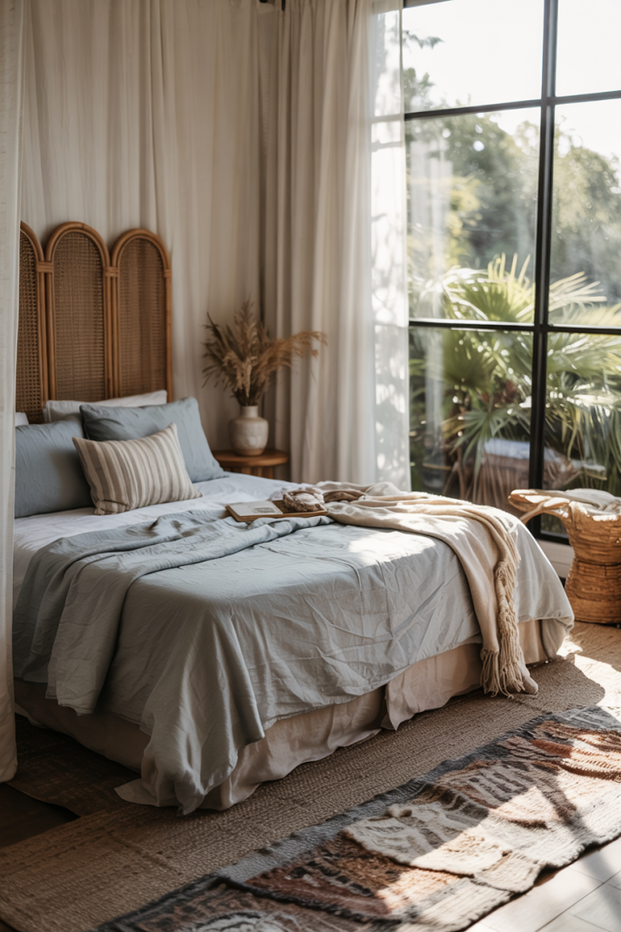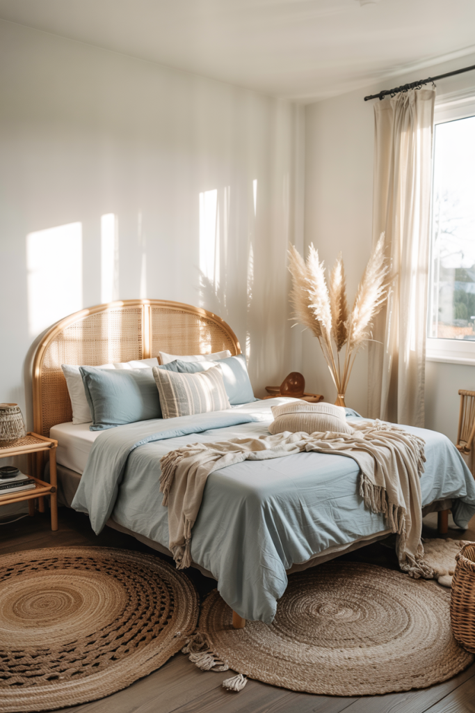 This idea blends airy fabrics, rattan accents, and gentle hues for a breezy bedroom feel. Subtle touches of boho style paired with light blue notes make the room calming yet expressive. It’s a perfect fit for those who want visual softness without losing personality.