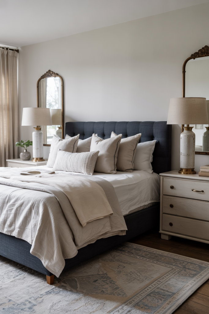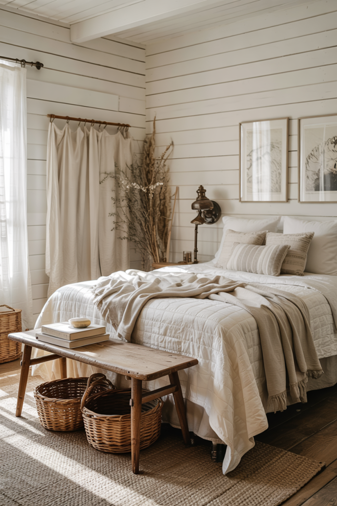 When planning this style, consider real homeowner behavior: farmhouse bedrooms tend to collect decorative items fast. Keep surfaces edited and rely on larger, intentional pieces instead of many small accents.