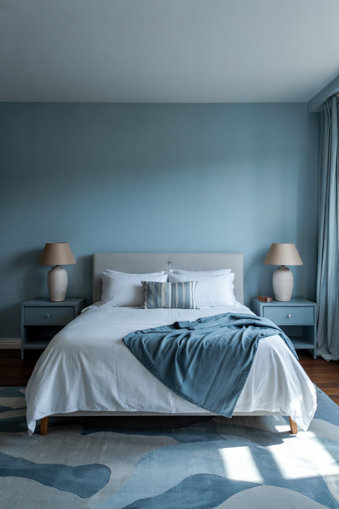 An expert tip: keep blue tones desaturated to avoid coldness. When paired with warm wood or brushed brass, the room gains balance and feels softer—a detail designers often use to make “cool” palettes feel human and cozy.