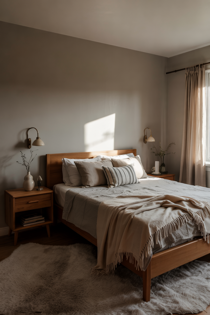 Gray walls paired with warm-toned woods strike a timeless balance. This combination feels modern without feeling cold, especially when layered with natural textiles. It’s a great match for homeowners who want an understated space but still enjoy soft, textural accents and a hint of simple styling.