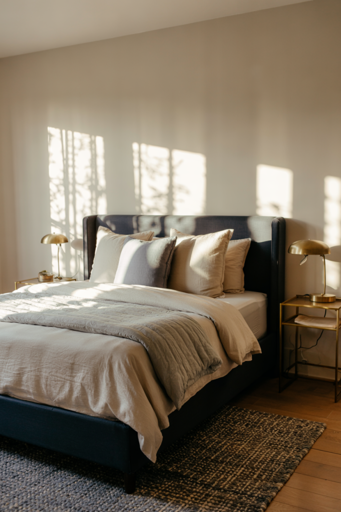 A quiet navy palette creates a serene base for layered textiles and warm glows. This look feels especially intimate at night when soft lighting reflects against the darker tones. Adding a few navy accents and gentle, relaxing warm notes keeps everything cohesive and cozy without overwhelming the room.