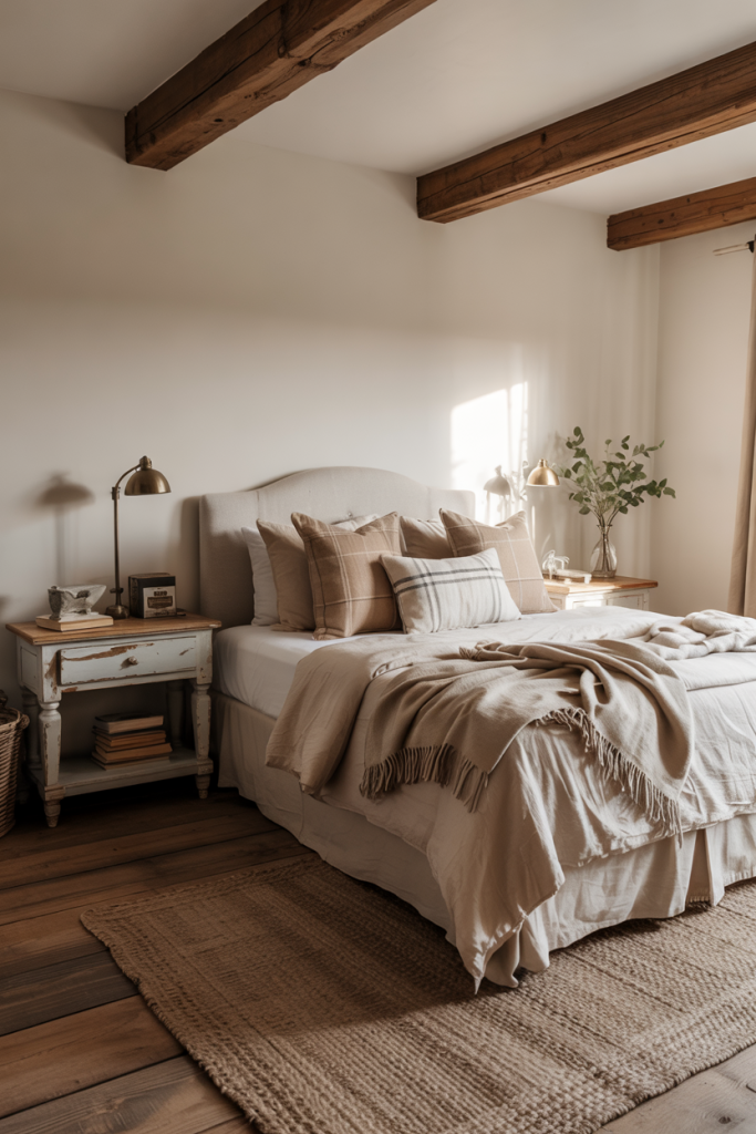 This cozy cottage-leaning style blends soft bedding, warm whites, and vintage accents. The look stays welcoming rather than fussy by mixing airy linens with subtle contrasts. Adding touches of cottage charm alongside gentle brown notes keeps the bedroom grounded and approachable.