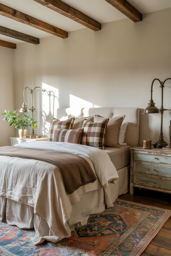 A modern farmhouse bedroom thrives on warmth, texture, and muted tones. Soft plaids, wood details, and handmade elements bring personality without clutter. Adding touches of farmhouse character alongside earthy brown notes creates a grounded, relaxing mood that feels inviting year-round.