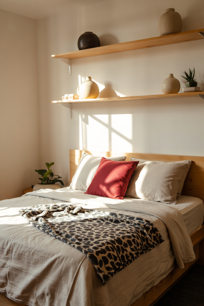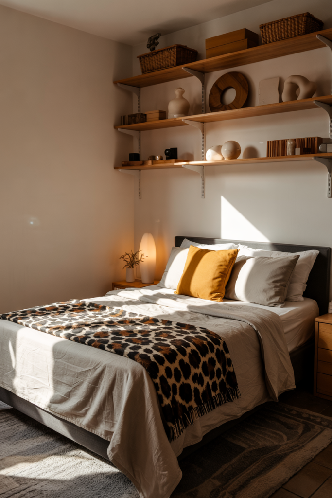 Pattern enthusiasts would love the way a cheetah print throw and accent pillow could quickly animate a small room. Using a cheetah print throw and pillow in the room goes beyond adding detail because the single print, when paired with earthy elements, works well in balancing the space.