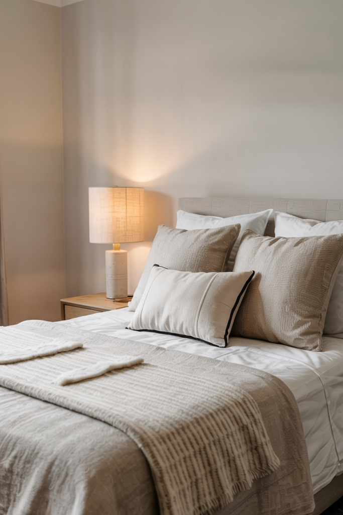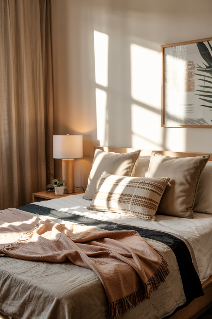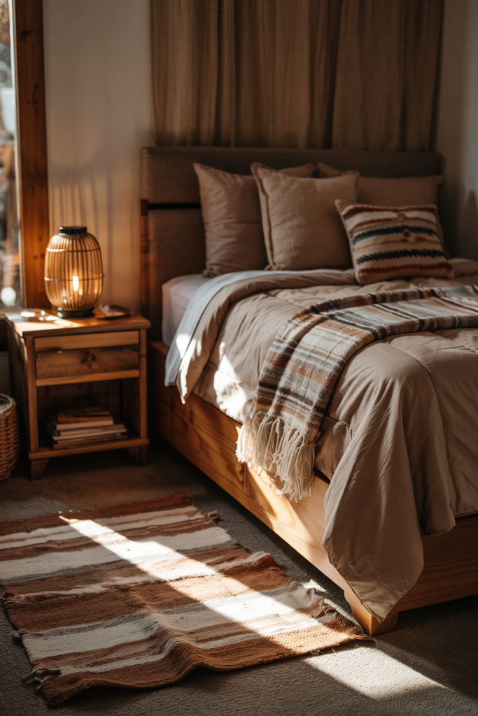 Bedding in earthy tones and light, textury materials специалистен_Light_Earthy_Textured_Bedding adds warm and calm notes in cramped dorm rooms. Using throws, cotton bedding, and earthy tones with texture provides an inviting, lived-in space and keeps the space clean. Adding emphasizes and earthy tones, and subtle touches from the use of black furniture, helps bring the room back down.