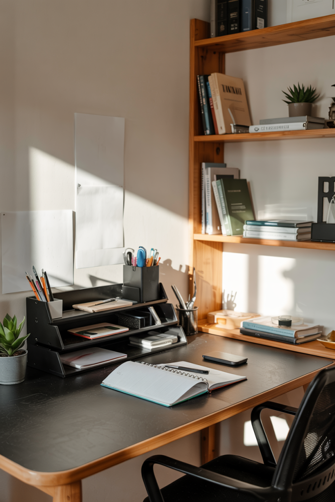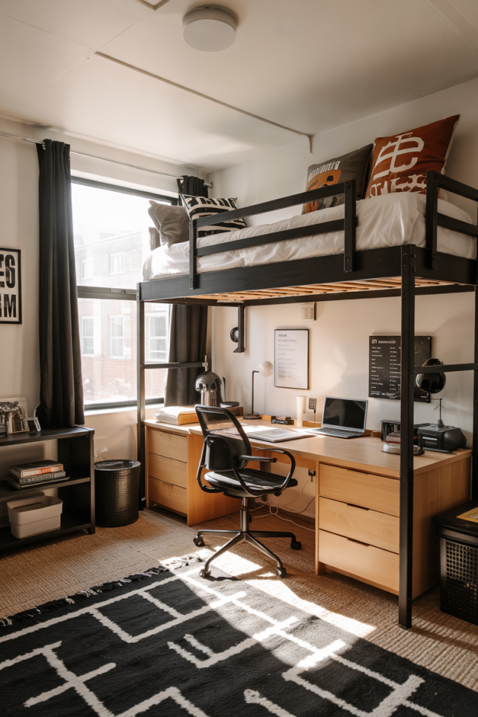 A modern black accent-themed student room with an organized desk configuration provides an adequately structured and organized appearance, particularly in smaller dorm settings where lines play an important role. Using the principle of blending in some black detail and an adequate approach provides an elevated, rather than harsh, appearance in the work area.