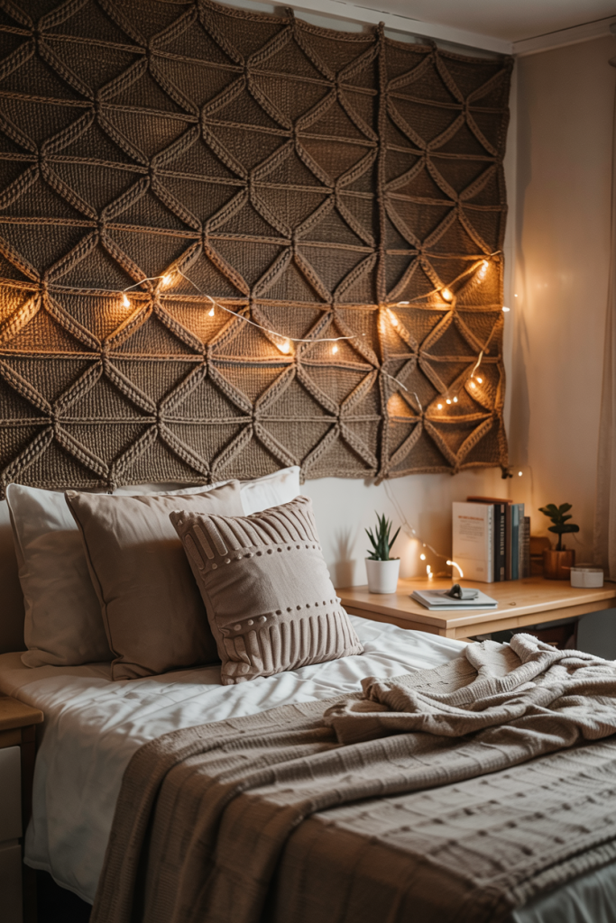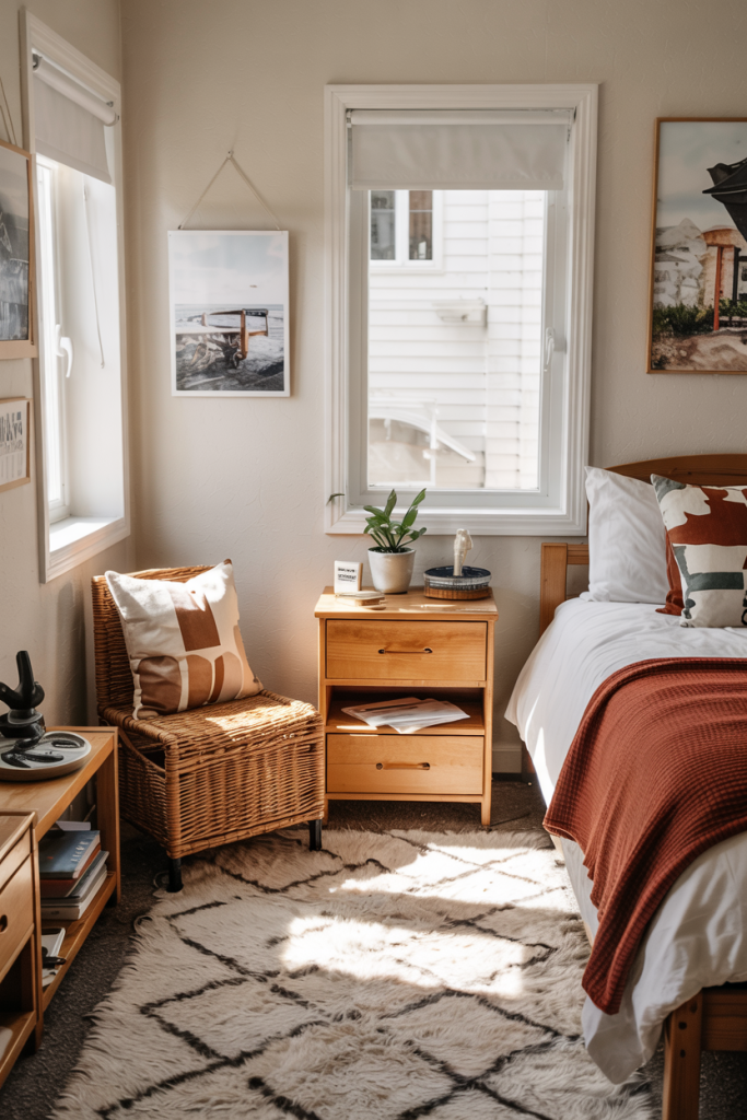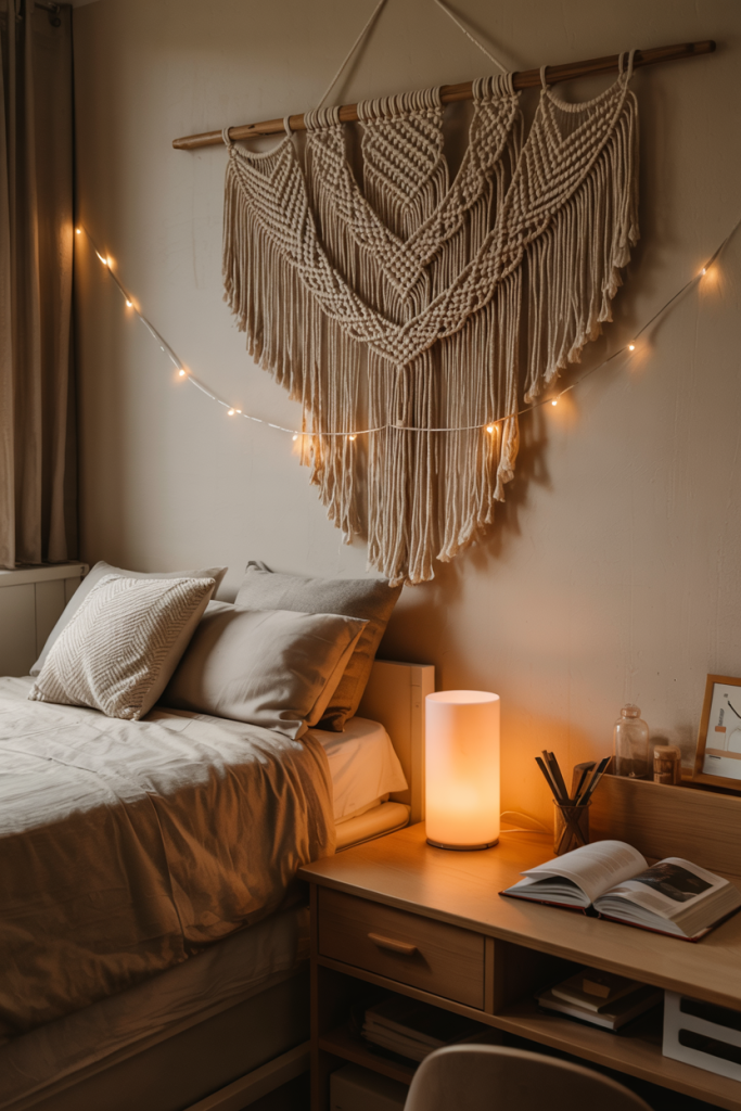 The effect of adding texture and light, easy-to-hang wall décor transforms the typical stark white college dorm room wall. The earthy tones, woven items, and natural materials add depth. Using warm and earthy tones and combining them with brown and an earthy color scheme brings the space together and keeps it relaxing.