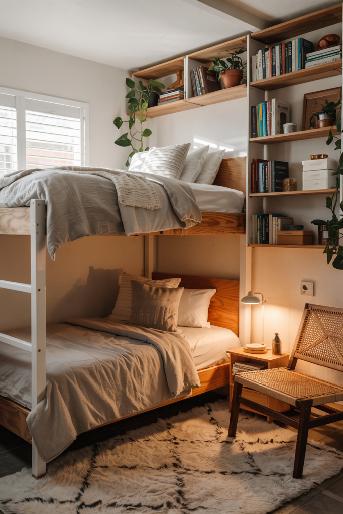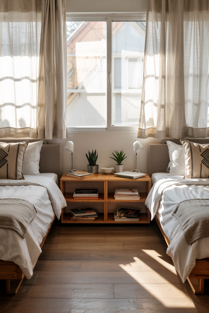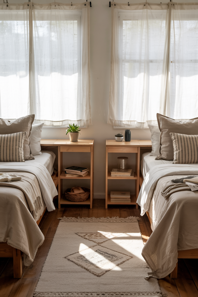Minimal rooms appear and feel cleaner and more peaceful, and in the double room, disarray can quickly accrue. The softly colored and systematically organized space cultivates a haven in the room. The added aesthetic touch and double layout help create symmetry.
