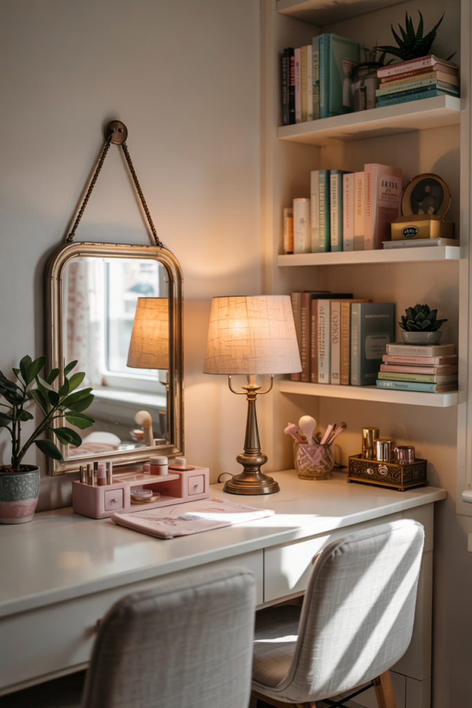 In the case where roommates want a space in the room where they can get ready together, setting up a shared space in the form of a small nook with a shared vanity would be perfect. “A small story: Now, roommates claim this small ‘getting ready’ area becomes their ‘favorite spot in the room.’”