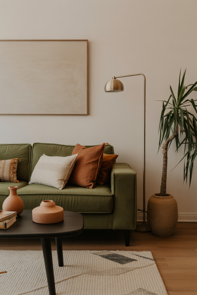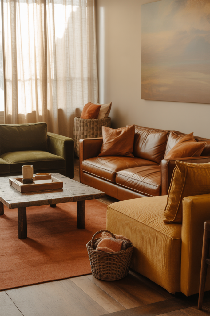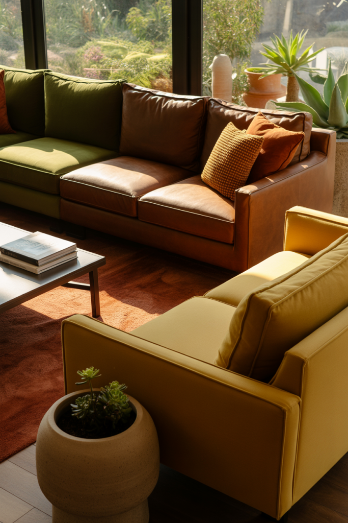 Using earth tones is the most natural way to create a grounded interior. Think brown couch, green couch, and even a mustard couch as your anchor pieces, paired with clay walls or terracotta rugs. Designers like Emily Henderson often emphasize how these palettes add depth without feeling overwhelming. In small spaces, earthy shades bring harmony, while in open layouts they provide a modern yet cozy flow. Even a grey couch can blend into the palette with the right cushions and throws.