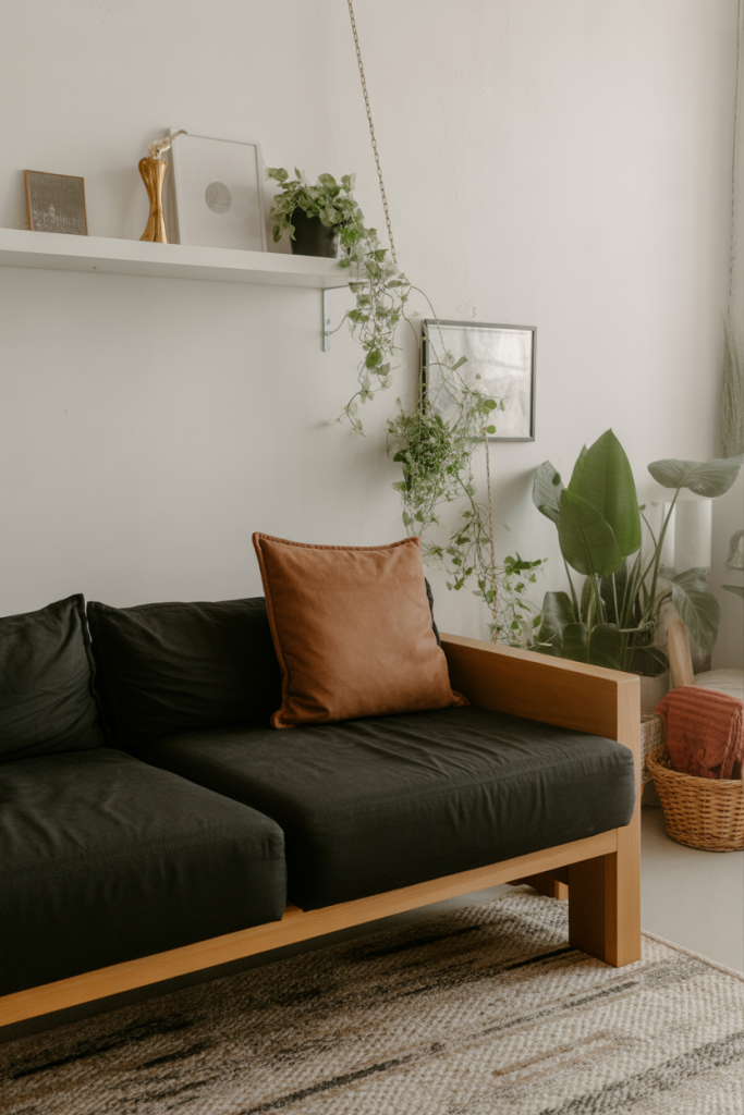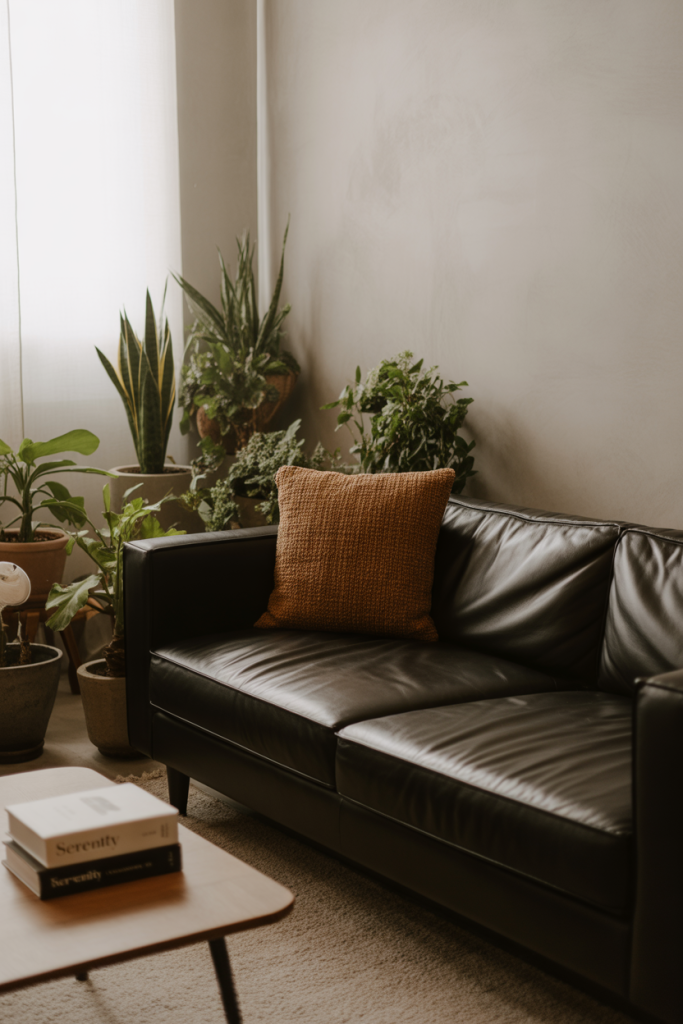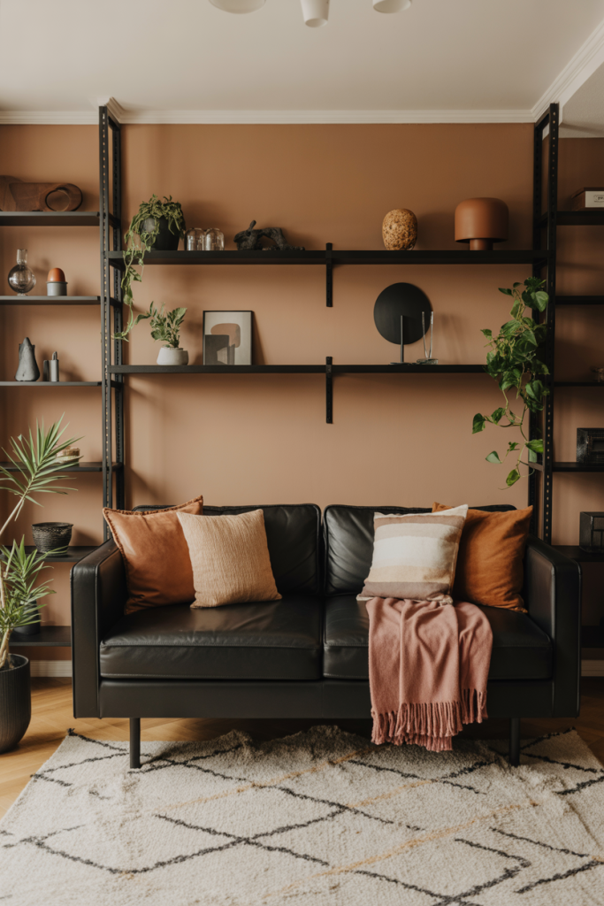 Adding black and white elements into earthy living rooms is about contrast, not sterility. A black couch with whitewashed walls, layered with brown couch accents and greenery, creates a crisp but grounded design. This works well for minimalist homes that still want earth tones warmth. It’s also a very affordable update—often just a matter of swapping textiles and accent pieces. The result is timeless and cosy.