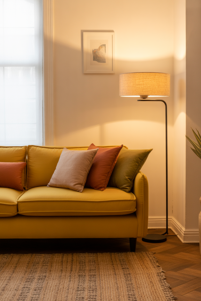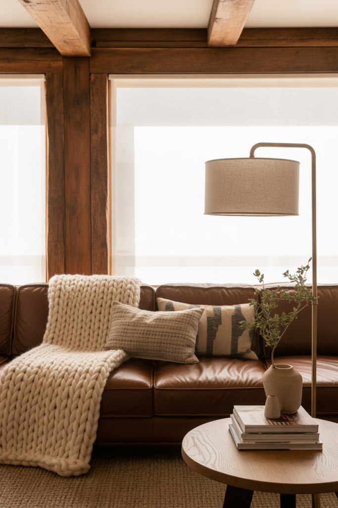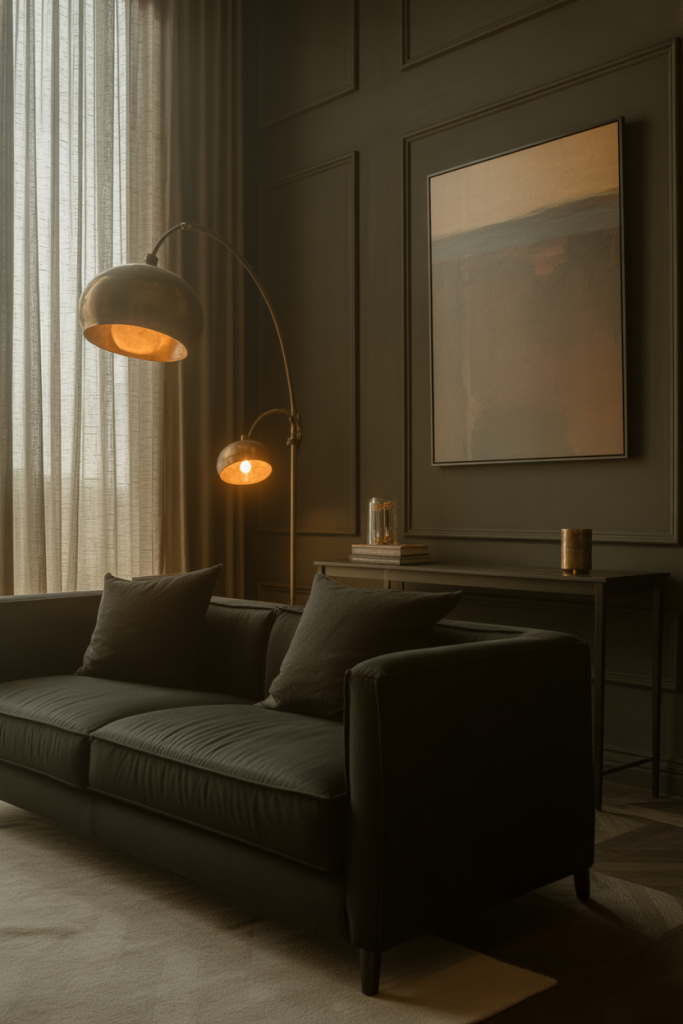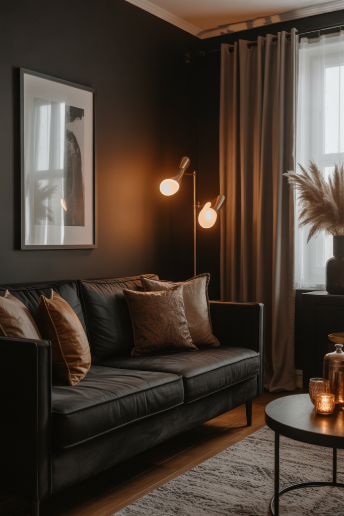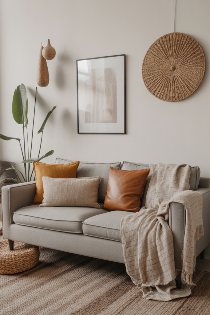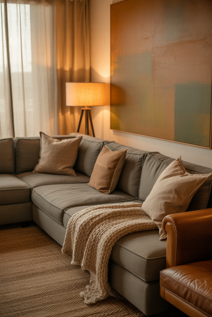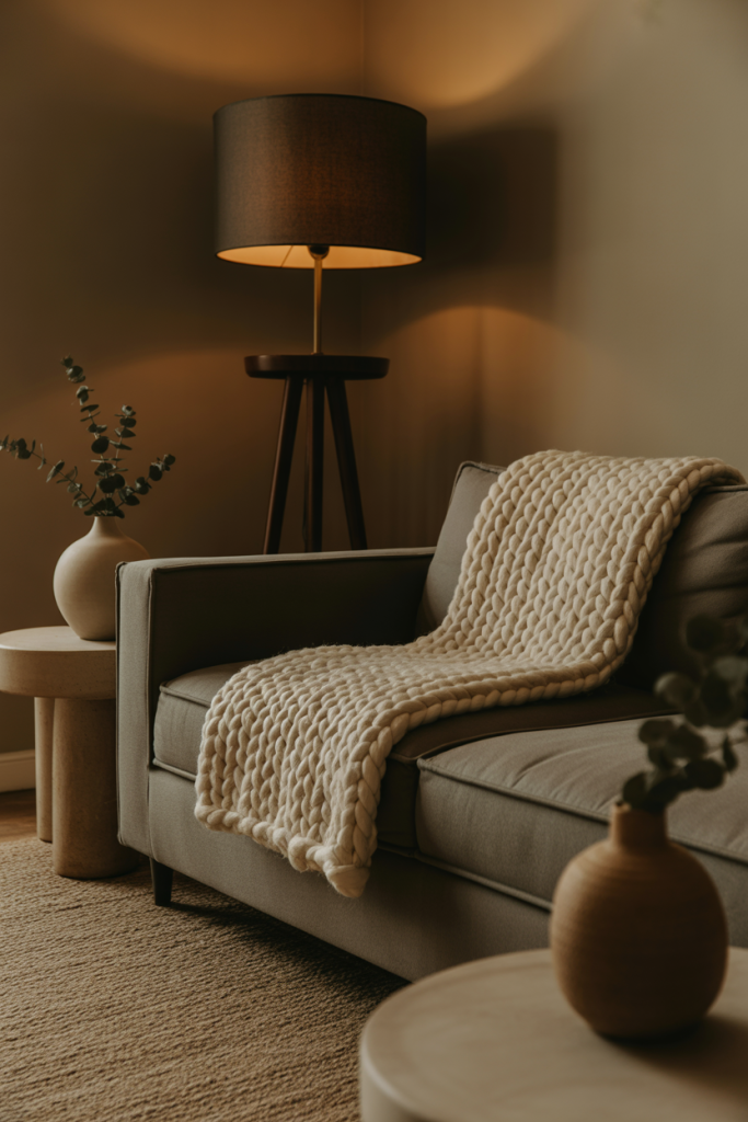 Earthy design isn’t only about furniture—it’s also about atmosphere. In 2026, designers are layering moody lighting through wall sconces, floor lamps, and candles. A grey couch with a woven throw, paired with dark lampshades, creates depth and cozy evening ambience. This approach is affordable yet high impact, and it works in both small spaces and large open-plan rooms. Think organic modern with a touch of drama.