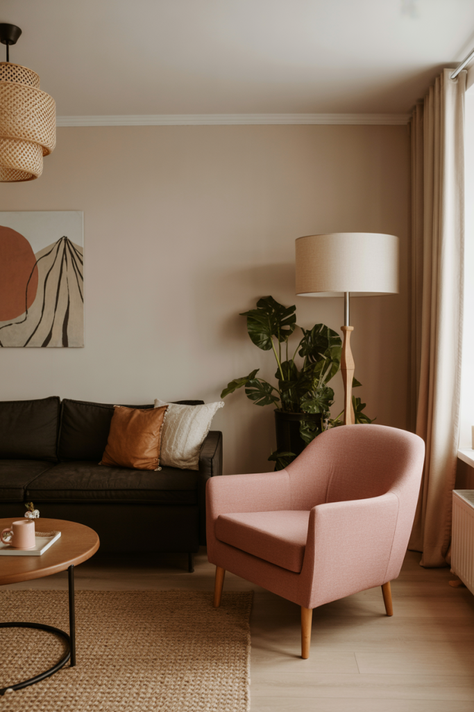 While earthy palettes are usually muted, adding pink can bring softness and warmth. A pink rug, cushions, or an accent chair balances dark wood or a black couch, making the space approachable yet stylish. This idea works beautifully in modern and bohemian homes, especially for people who want personality without sacrificing simple calm. Designers often say pink is the new neutral when blended with earth tones cozy elements.