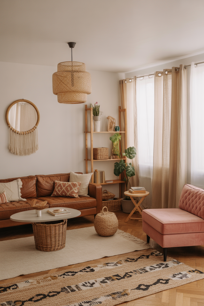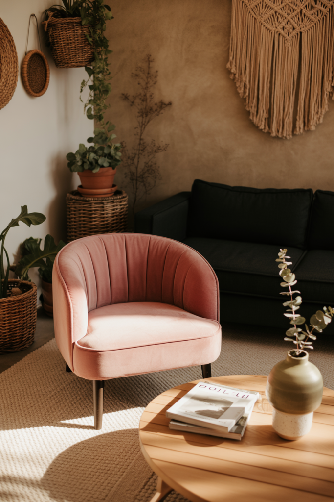 The bohemian earthy living room thrives on collected textures and colors. Mix a pink accent chair, woven baskets, layered rugs, and a brown couch. Unlike minimalist interiors, boho allows for playful freedom while keeping earth tones as the foundation. In 2026, bohemian style is leaning toward sustainability, with affordable vintage finds and secondhand treasures making spaces feel soulful. A touch of California sun-drenched style often sneaks in through rattan and bamboo.