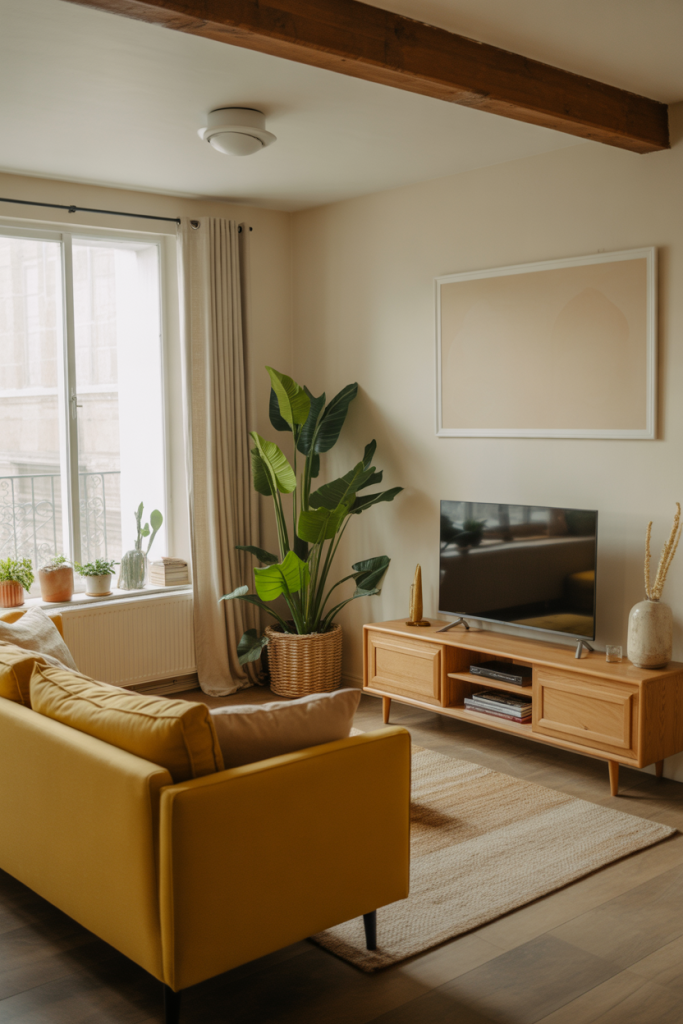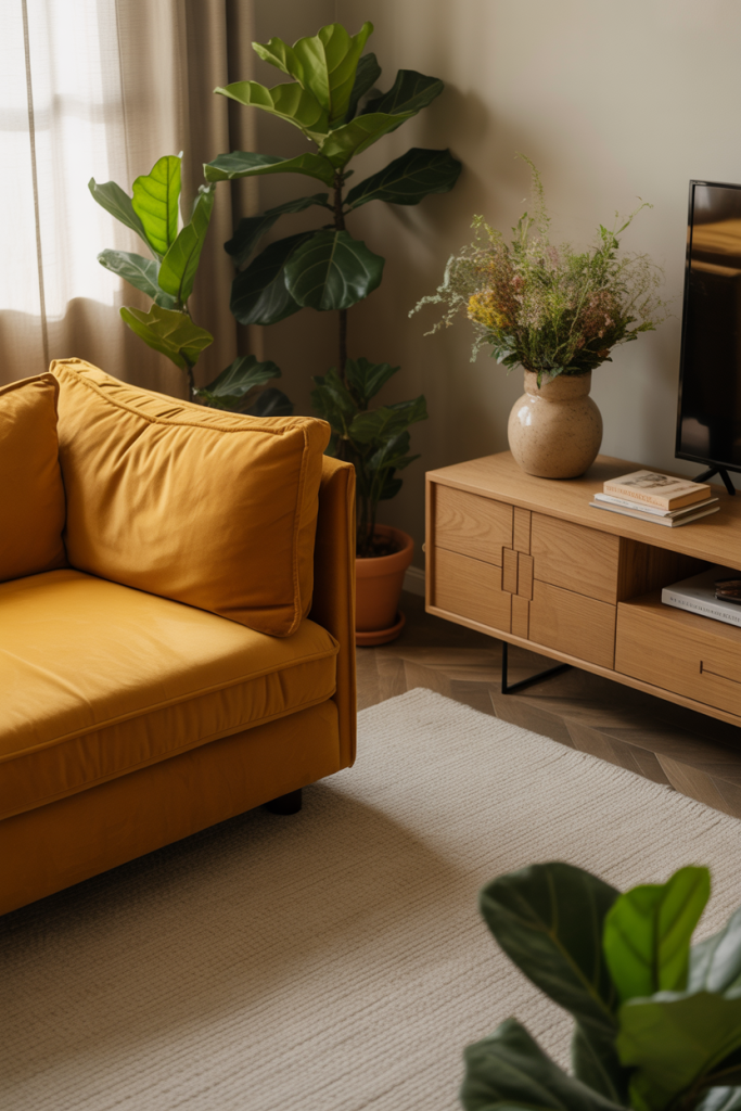 A mustard couch has become a bold centerpiece in 2026 earthy interiors. Its golden tone pairs well with earth tones, from clay walls to woven baskets. In California, designers often use it as the bridge between rustic and modern elements. Add a tv console in natural oak, a wool rug, and green accents for balance. This is an affordable way to update a room while keeping it cheerful and cozy.