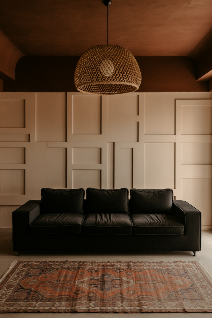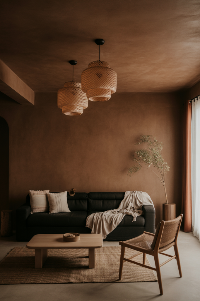 Most people focus on walls, but in 2026, painting ceilings in dark earth shades is trending. A deep taupe or clay ceiling adds intimacy while grounding a space. With a black couch below and woven lighting, the room feels instantly moody yet cosy. This look is especially impactful in small spaces where vertical drama creates character. Designers suggest pairing with simple wall art and natural rugs to keep it balanced.