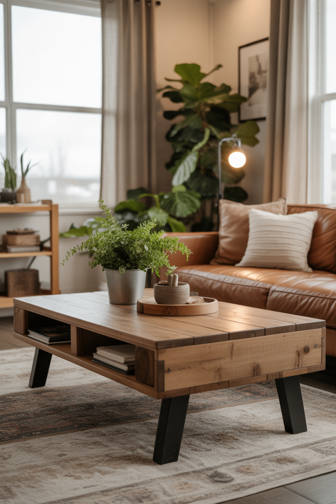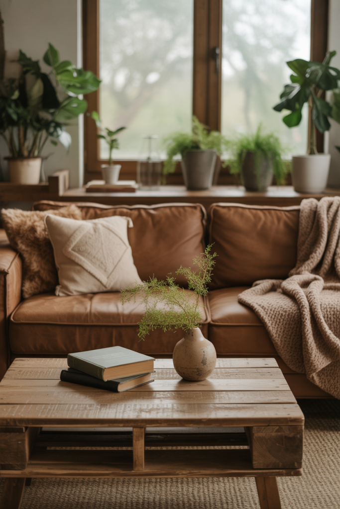 Earthy living rooms thrive on character, and one of the most affordable ways to achieve it is through rustic DIY updates. Sanding and staining a reclaimed wood coffee table, adding clay-colored wall paint, or slipcovering a brown couch can refresh the room on a budget. Many home bloggers emphasize the charm of imperfections, making a space feel personal and cosy. Pair with green plants and a woven rug for a complete look.