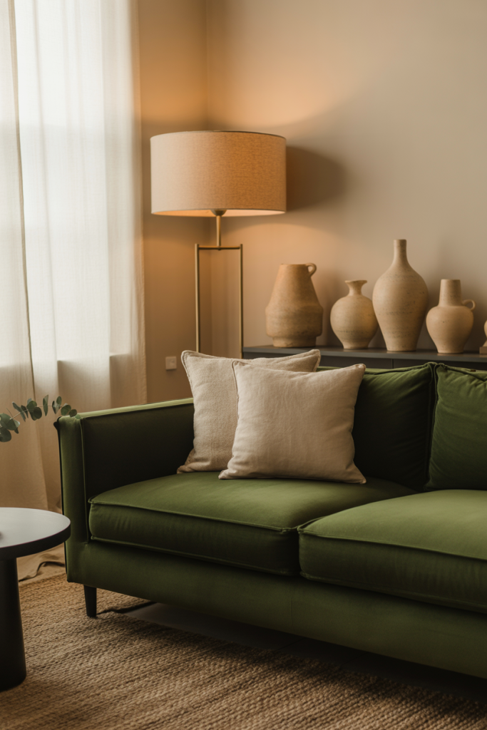 In 2026, a green couch isn’t just furniture—it’s a statement. Designers love pairing it with a black accent table, clay pottery, and woven blinds. The green adds vibrancy while blending seamlessly into earth tones. For a more modern spin, add sleek brass or black lamps; for bohemian, bring in colorful throws. It’s versatile, cosy, and timeless. Even in small spaces, a green couch makes the room feel alive.