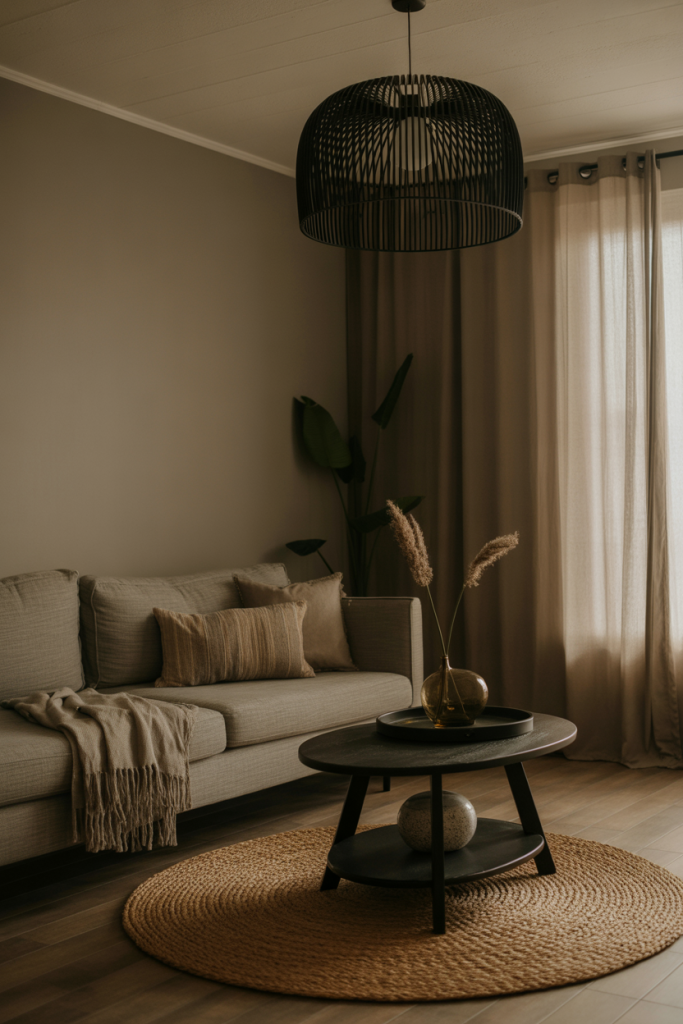 While earth tones are warm and grounding, adding black accents like a black couch, shelving, or lamps gives structure. The trend in 2026 favors contrast, as seen in many modern interiors. A cosy rug, green plants, and even a pink throw can balance the darker details. Designers emphasize that simple black accents act like eyeliner—they frame the room, making natural textures like linen, rattan, and clay stand out more clearly.