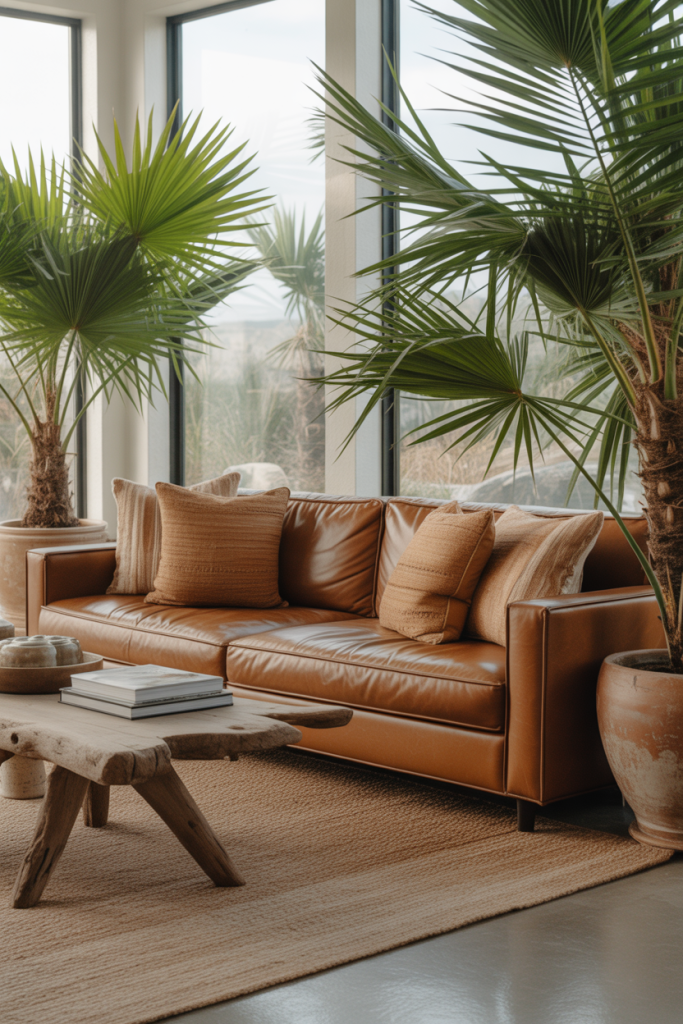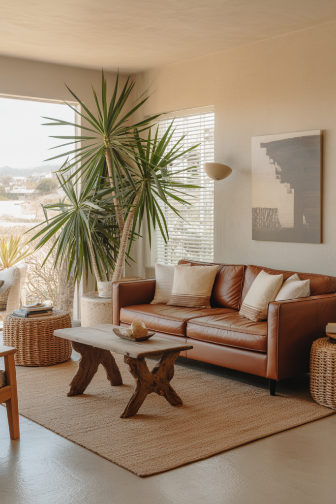 Blending California coastal style with earthy interiors is a 2026 trend. Picture a brown couch with sandy beige rugs, driftwood coffee tables, and oversized palms. The look is rustic yet modern, grounded in earth tones but breezy enough to feel fresh. Add a tv mounted on a plaster wall and woven blinds to complete the vibe. It’s casual, cosy, and perfectly suited for indoor-outdoor lifestyles.