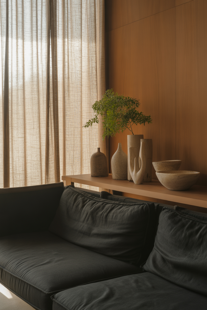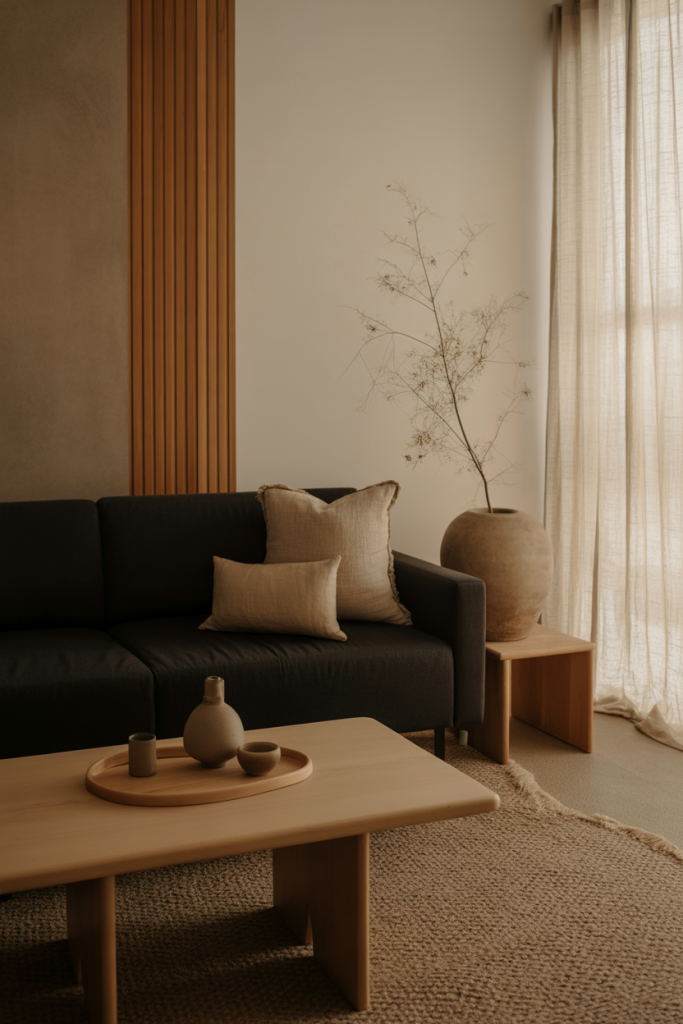 A minimalist earthy living room doesn’t mean cold or empty—it means stripping back excess and focusing on quality. Pair a black couch with warm wood, linen curtains, and soft clay ceramics. The balance of dark and light creates an inviting mood that feels uncluttered yet layered. The trend in 2026 leans toward “less but better,” something Nate Berkus often talks about—choosing fewer, affordable pieces that truly matter. This approach works especially well in small spaces where every object counts.