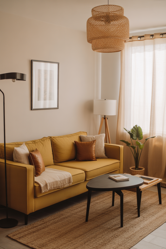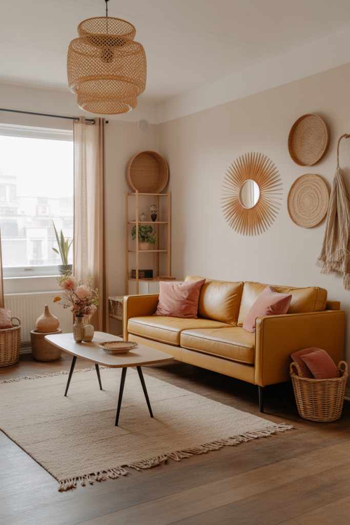 For those who love personality, pairing pink and a mustard couch brings playful charm to earthy interiors. The warmth of mustard grounds the palette while pink adds softness. Designers recommend balancing these colors with earth tones walls, woven baskets, and wood floors so it stays sophisticated. It’s a clever way to make a cozy, stylish statement without being overwhelming, especially in bohemian or modern living rooms.